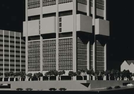 Rather horrifying design for a tower for #RMITUniversity, cnr #SwanstonStreet and #LaTrobeStreet, 1969, #BatesSmartandMcCutcheon architects (now just #batessmart). Would have replaced #StoreyHall and overshadowed the #statelibraryvictoria forecourt. The raised podium would possibly have been the worst part. Much prefer the Edwardian shirt factory, even with the green brain. What looks like a much lower smaller part to the left was built by 1976, buildings 12-14, and it’s bad enough. I like Brutalism, but this one is just sheer concrete block walls and mean little windows and very poor street interface, the last part greatly improved in@the last few years. First mage @nationallibraryaus, brain from the internet, then streetview.