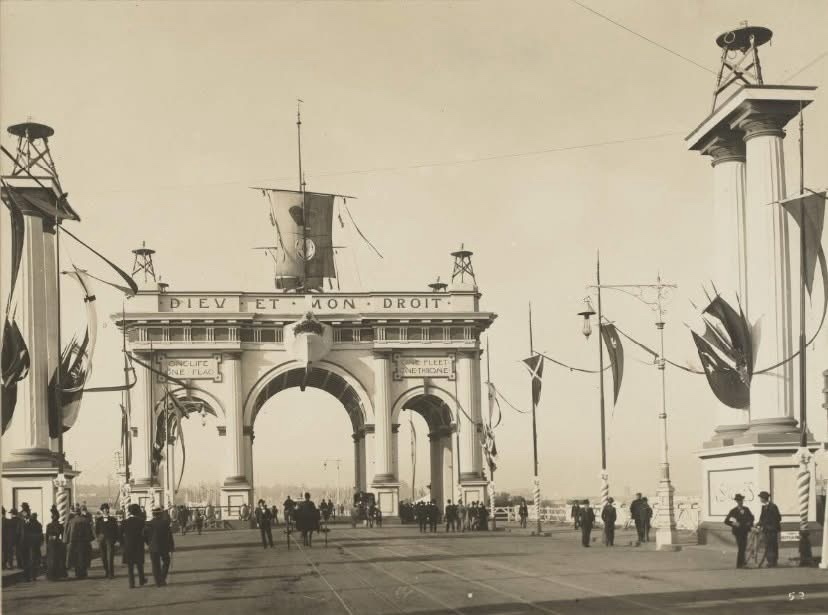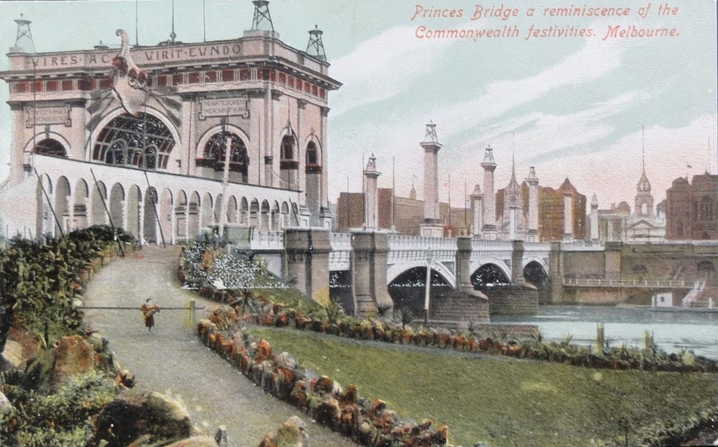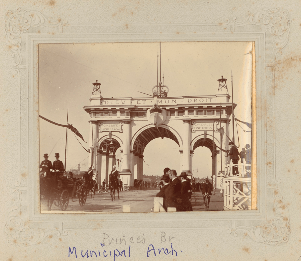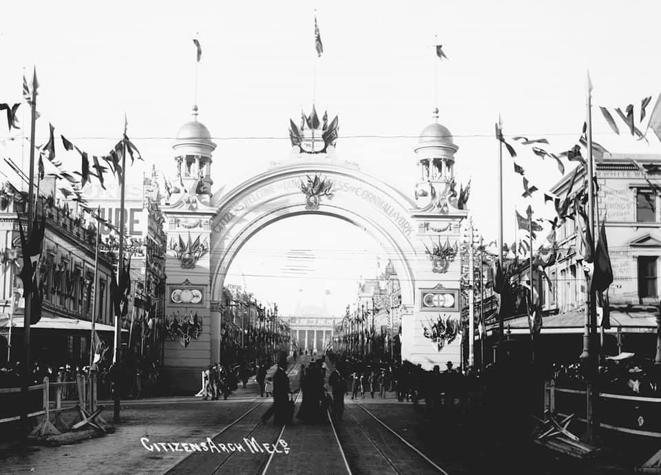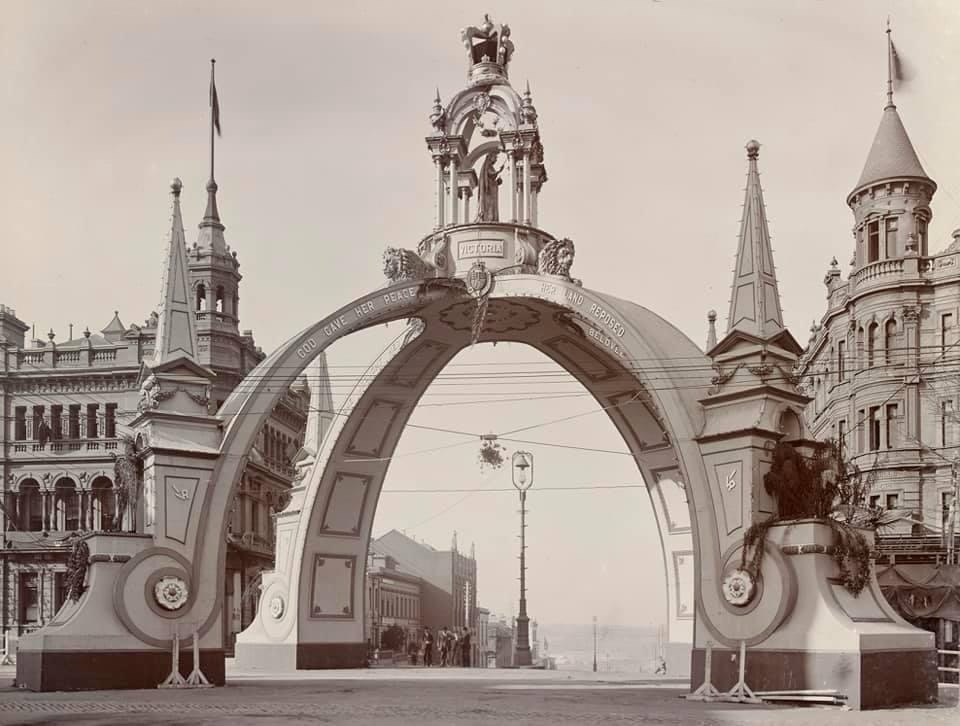 This grand triumphal arch was built over Princes Bridge in 1901 by the City of Melbourne to welcome the Duke and Duchess of York to open the first Federal Parliament.