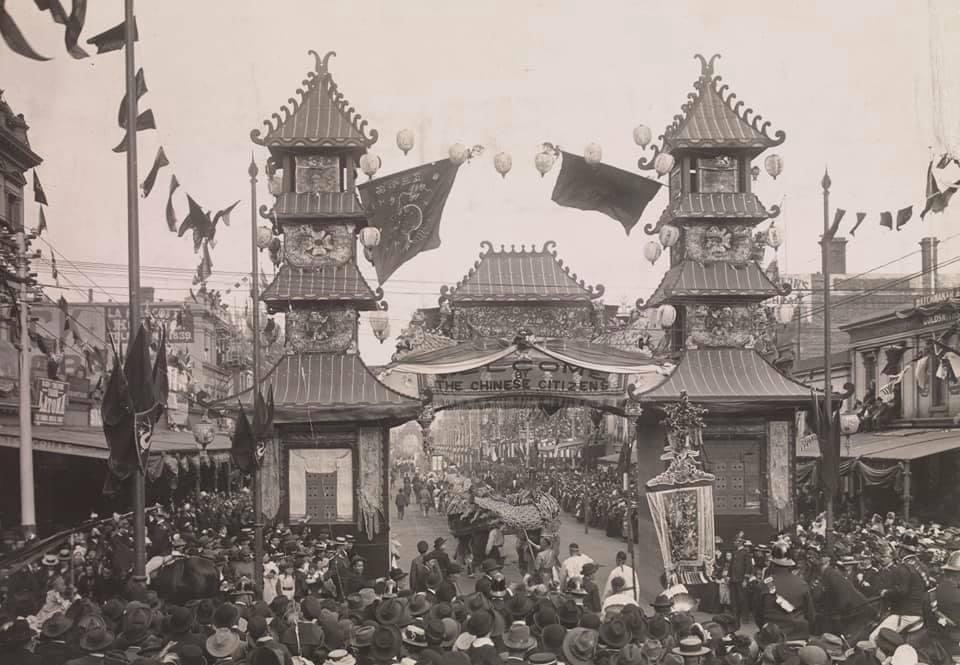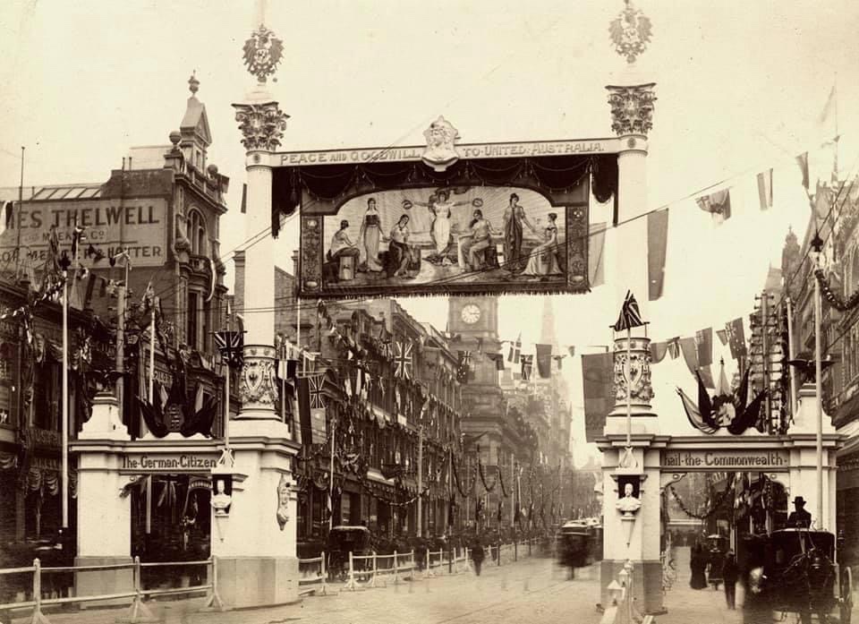 There was a tradition of temporary arches across the street for celebrations, and for Federation, quite a lot were put up. Especially since the Duke of Cornwall (later George V) was about to arrive to open the first Australian parliament at the Exhibition Buildings on 1 Jan, 1901. The first one I’ve shown, at Collins & Russell, was quite mad. Some were erected by various organisations and communities, with for instance a Chinese style one put up by the Chinese community. Thanks to @spoontzu for posting these to FB.