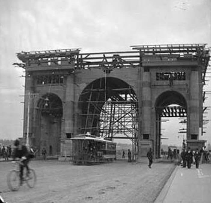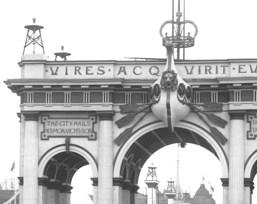 It was designed by Harold Desbrowe Annear in a very bold classical style, without too much flourish, but all white with details in deep red, the navel triumph symbol of the prow of a ship, lots of flags and tripod braziers on top lit at night. There were six pairs of columns as well on the bridge, representing the six states.