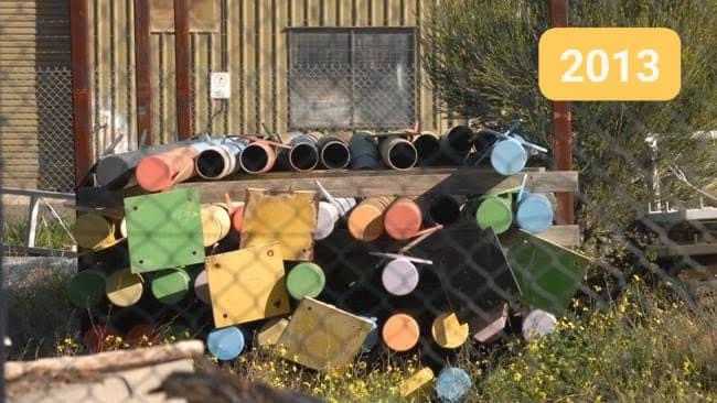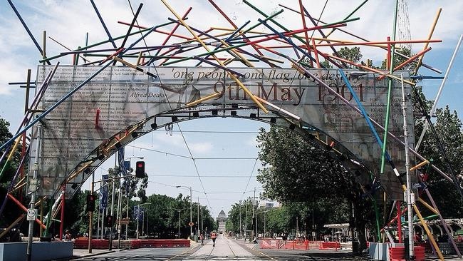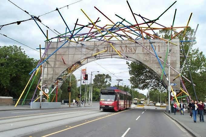 I quite liked it, though no idea if the design meant anything. The (in)famous ‘pickup sticks’ Centenary of Federation arch over St Kilda Road in 2001, designed by Fooks Martin Sandow. The second photo is from the Herald, which did a story in 2013 about Hume City Council, who had taken on the arch after dismantling in 2002, but never re-erected it, the parts just lying in their store yard. FB friend Steve Stefanopoulos took a photo of the parts in the yard recently, so they’re still there, last pic. 1st photo Vigsig, 2nd photo Herald, close up didi on Flickr, store photos the Herald.