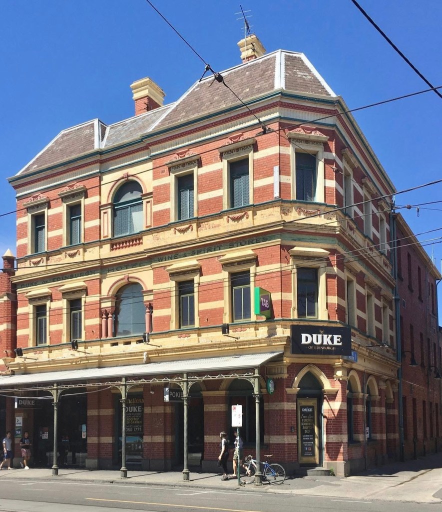 The splendid and unusual Duke of Edinburgh Hotel in #SydneyRoadBrunswick. Great stripey #QueenAnneStyle, can’t think of another pub quite like like it, and don’t know date or architect (but must be about 1890). Has surviving (or repainted) signage in #eaudenil, and a half-hearted repro verandah, and it makes a great set piece with the setback 1920s post office next door (now Penny Black).
