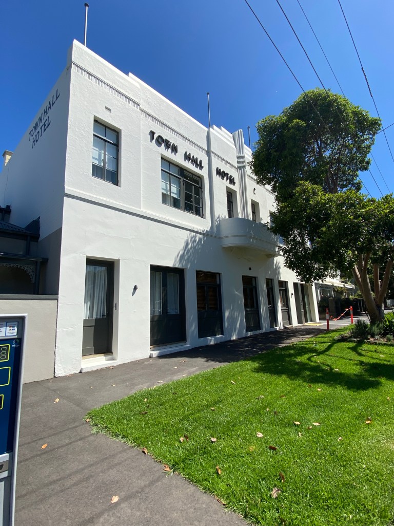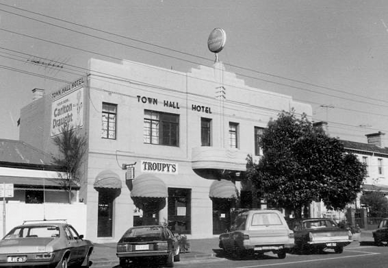 Some Art Deco niceness in Bank Street South Melbourne, half hidden behind a tree, so I almost didn’t notice it. A 1936 refacing of an 1880s pub, designed by F Morsby (info artdeco blog spot). Revamping pubs like this was pretty common in the 1920s and 1930s. Sold in 2019 and then closed, seems to be now apartments though I can’t find any sale or lease ads, just a few of inside before the same, no early features left there. All white of course, so details not so obvious, though probably all cream or grey originally. No idea why the sign is only on one half – as if they knew the tree was coming ! Also, it’s not exactly next to the town hall, 2 blocks away. 1981 photo from St Kilda Historical Society ‘Pots Pubs and Punters’ page.
