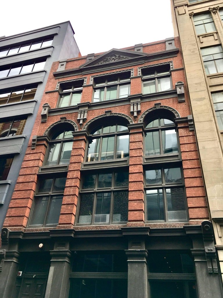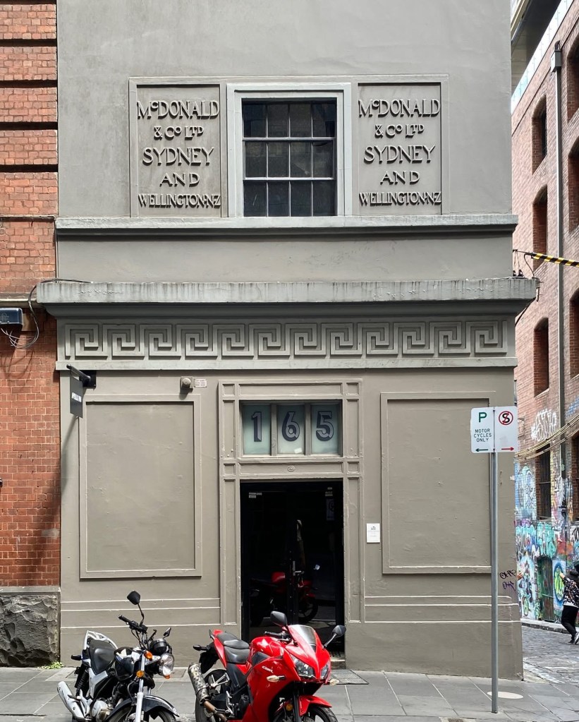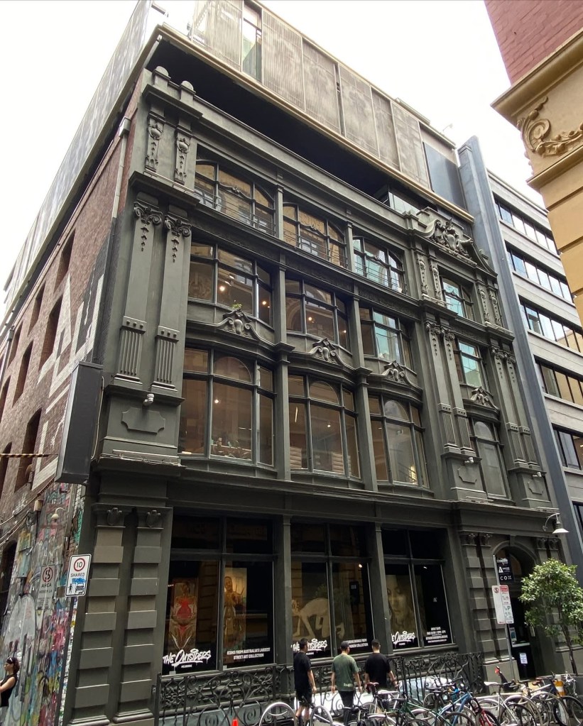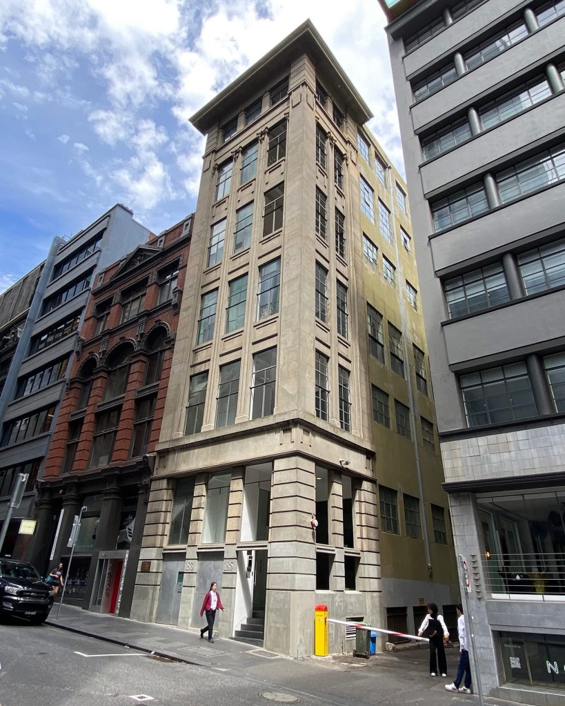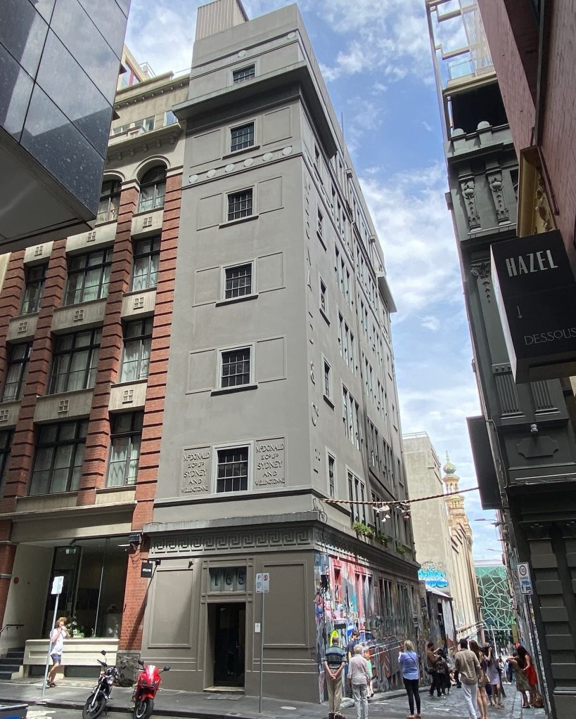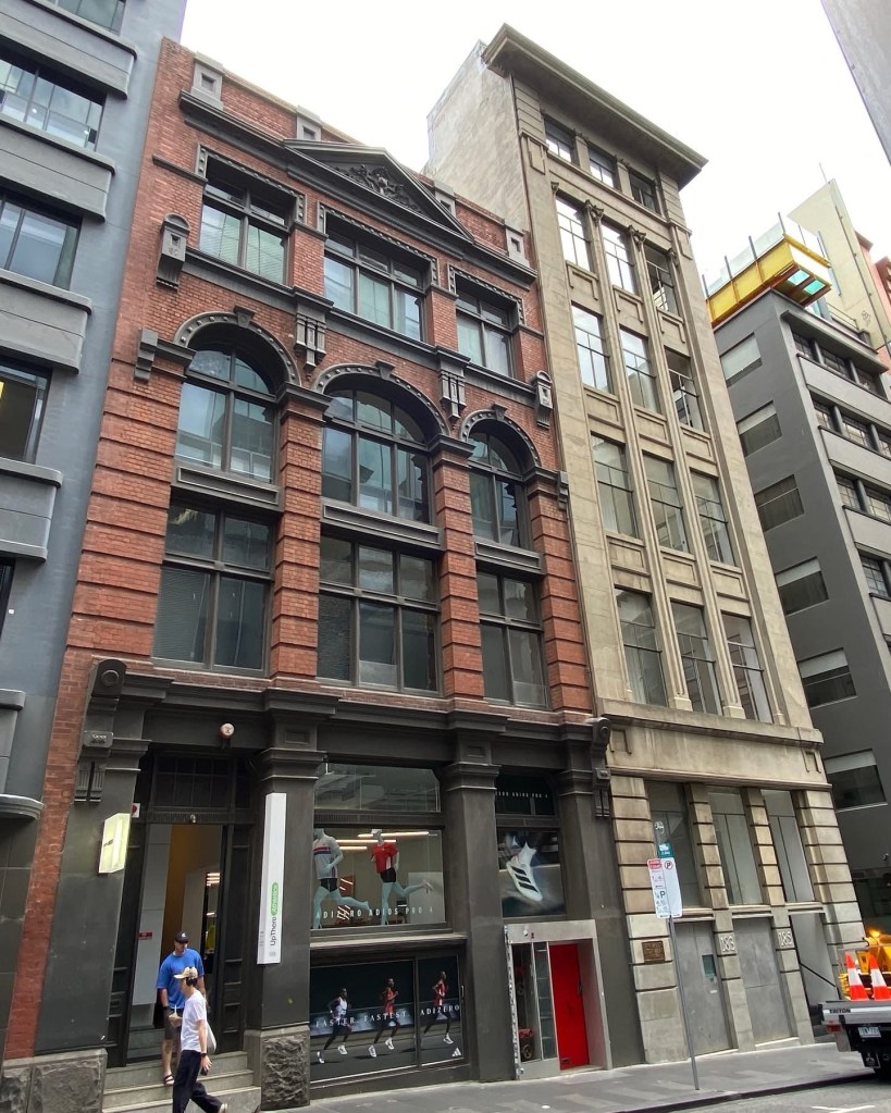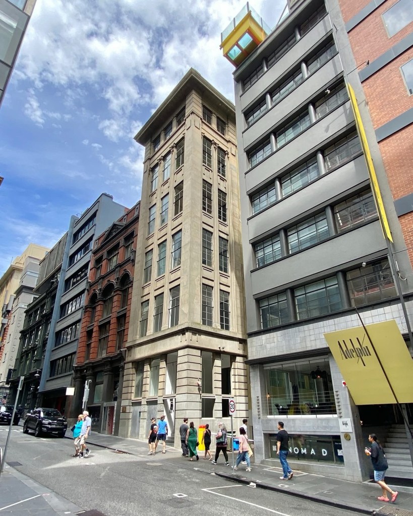 A fine streetscape we might take for granted, but so very Melbourne – Flinders Lane between Swanston and Russell, lined with multi-storey warehouses from the 1910s to the 1930s, mostly a similar height and width, all built for the rag trade or light industry, and all pretty much intact. Yum. First the Adelphi, created by @dentoncorkermarshall in 1992 by a do-over of a 1938 Joseph Plottel; then across a lane, a classical one by #TompkinsAndTompkins from 1924, then a red brick one from 1911 by William Pitt, then a Deco one from 1937, with nasty new windows. Then a beautiful one with huge windows and Art Nouveau details (and some unfortunate extra floors) from 1901 by King & Stainsley, and then above the tourists thronging Hosier Lane is McDonald & Co softgoods importer, with curiously small windows built 1924, designed by Robertson & Marks, and lastly one from 1909. Together they provide small quirky offices, including some fashion related showrooms, 2 hotels, and 2 are now apartments.