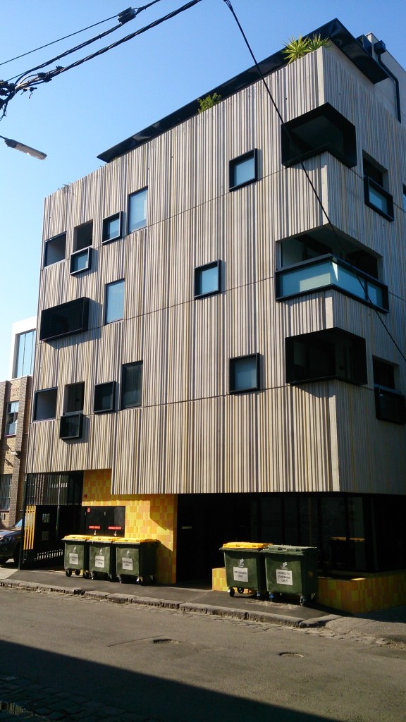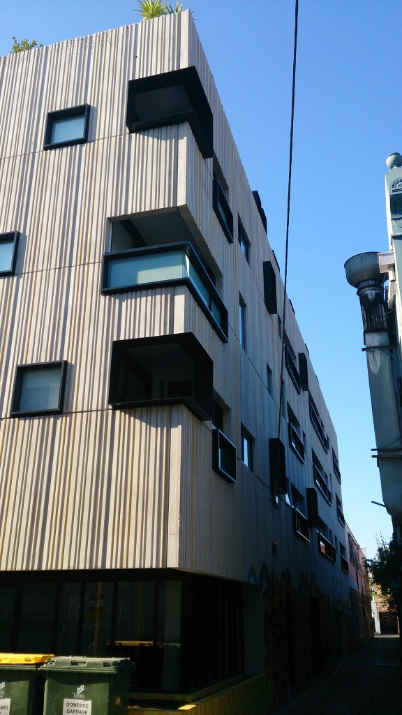 I quite like the severe rippled precast solidity of this new #apartmentblock near my house (which is actually called ‘Bespoke’ !). But with such deep set windows behind small ‘balcony’ openings on the south side, how dark must those lounge rooms be? Update 2024: it’s 81 Argyle Street, by @rothelowman, finished 2015, and above the 1st floor at least the one unit I found below looks out over roofs, and the balcony windows are all glass, and they’re actually quite spacious compared to so many others.