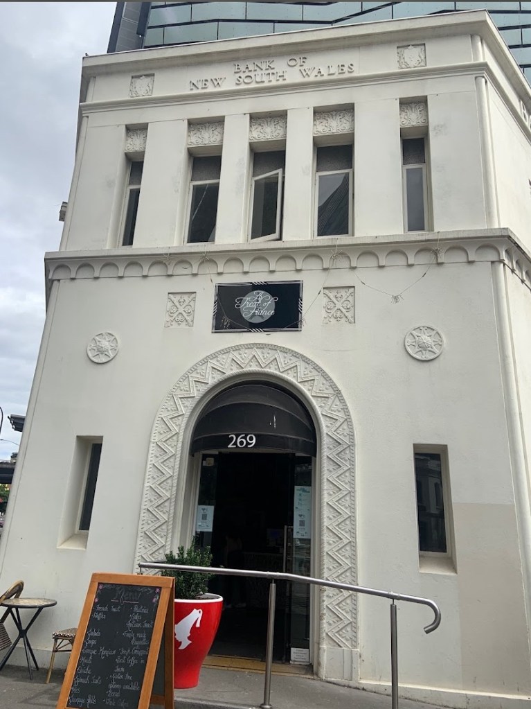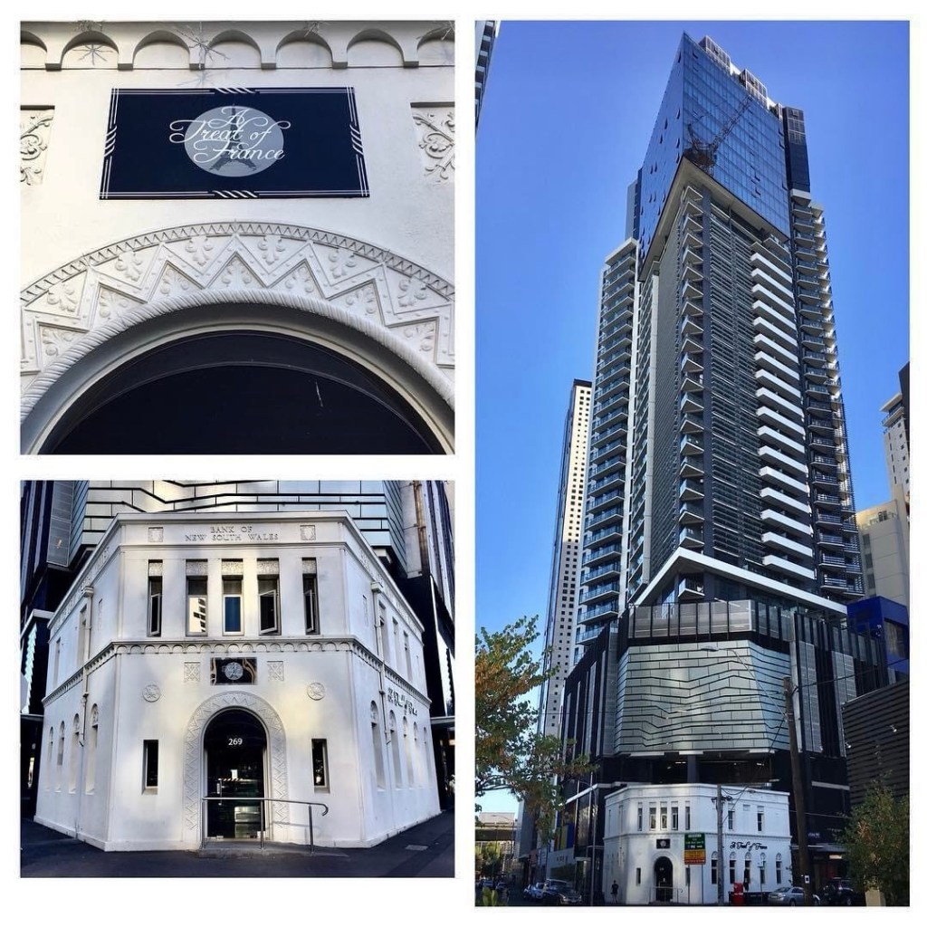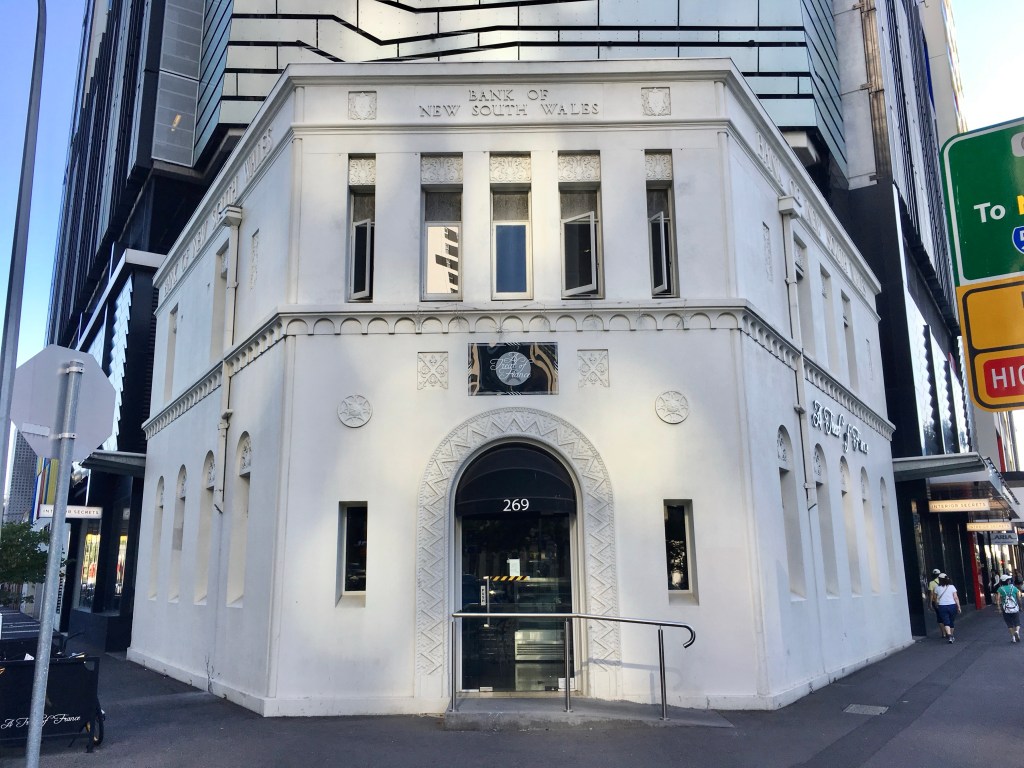 Bank of NSW, City Road, Southbank, 1932, #GodfreySpowers, rather nice and very unusual stylised Romanesque, with simple lines and zig zag details that look rather Art Deco. This bank must have served the low rise industrial and warehouse business that once dominated in this area. Now it’s a tiny #mote at the base of ‘The Bank’ (how creative) built 2011. Could have been worse, could have been just a facade, with a tower perched on concrete legs through it, like some others permitted recently. Instead, the interior is actually preserved ! At least the decorative ceiling is. Photos after the first not mine.