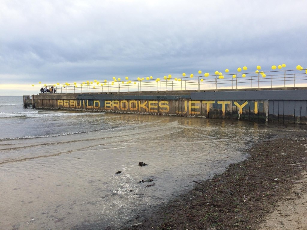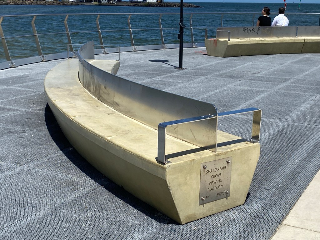 Finally got to see the new Brook(e)s Jetty at St Kilda Beach, near Luna Park, completed early 2022. It’s a nice idea, a 20m circular platform, with seating, and a floor largely of grating, with water sloshing below. Don’t know what it’s coated with, but it wasn’t hot on this hot day. The parts are very clunky concrete and stainless steel, all low maintenance long lasting I guess, but we’re lucky to have anything at all ! It’s only there due to a vigorous campaign by locals as Bring Back Brooks Jetty, formed when the old narrow timber original was suddenly demolished in 2015 by Parks Victoria, due to ‘safety issues’ (or just cost / maintenance issues). The jetty had been built in about 1910, named after fisherman Fred Brookes who had a boat shed on the beach, taking advantage of a timber lined main drain which poked out into the bay. It had been well used since then, for fishing, swimming and general delight. In 2019 Melbourne Water decided to rebuild the drain too, and was eventually persuaded to add a new jetty, and all stakeholders agreed on the circular platform idea. Just a pity it doesn’t have a bit more character. Last 4 pics from Bring Back Brooks Jetty Facebook page, B& W aerial is from c1920.