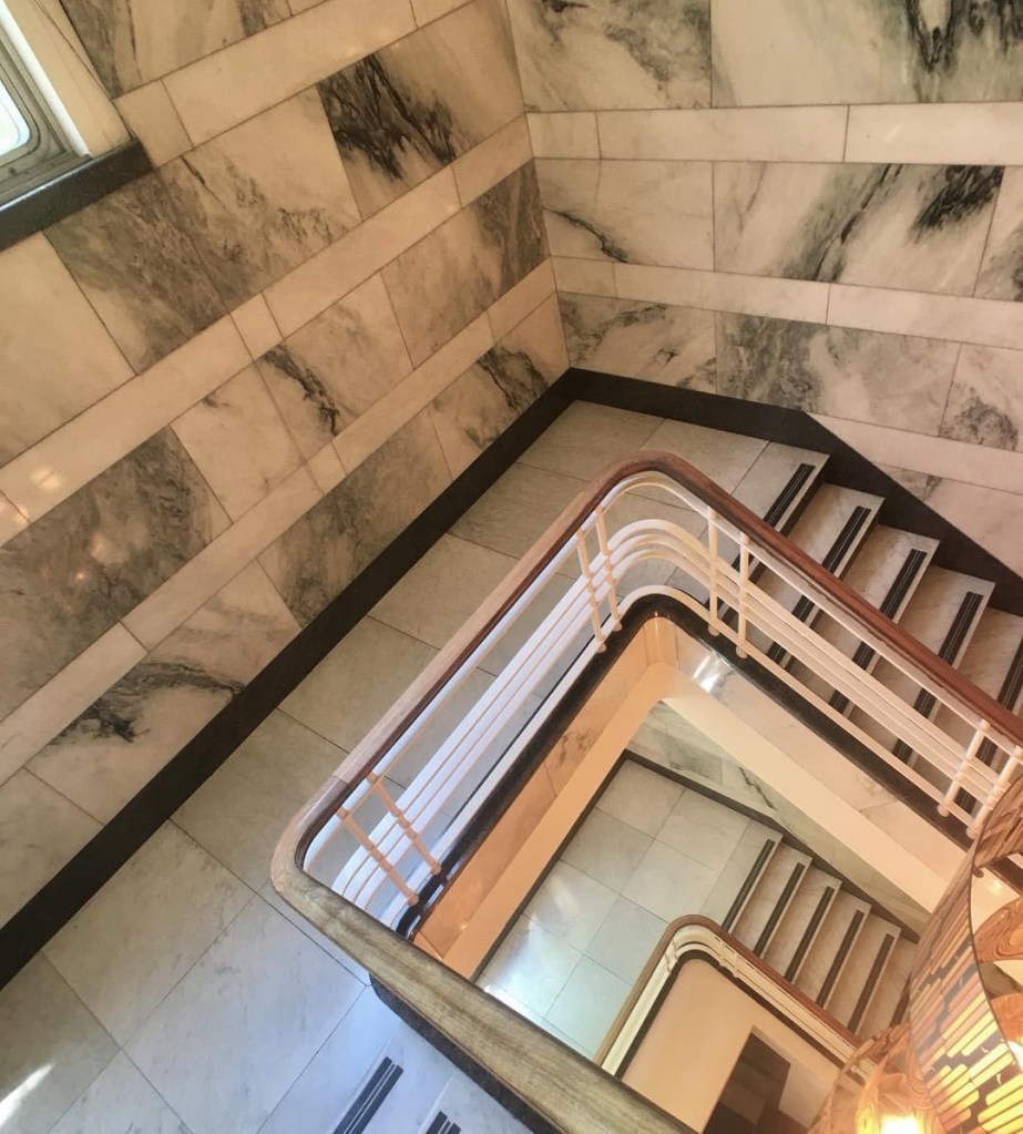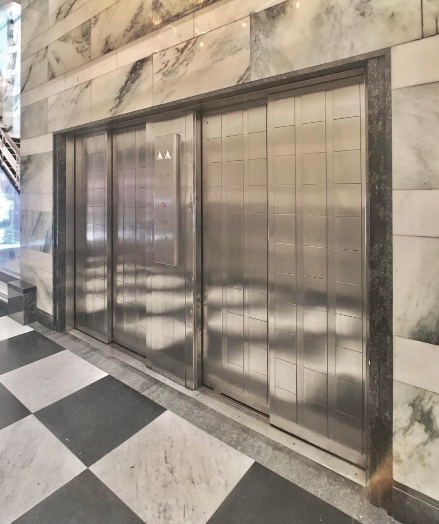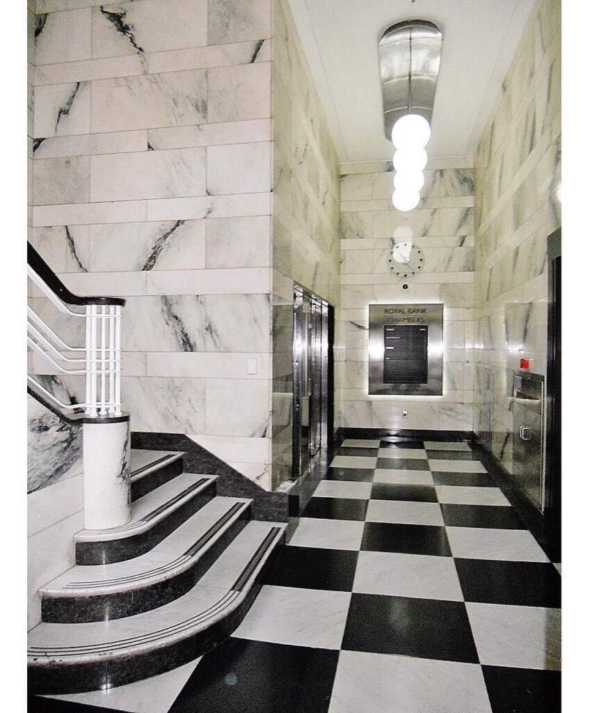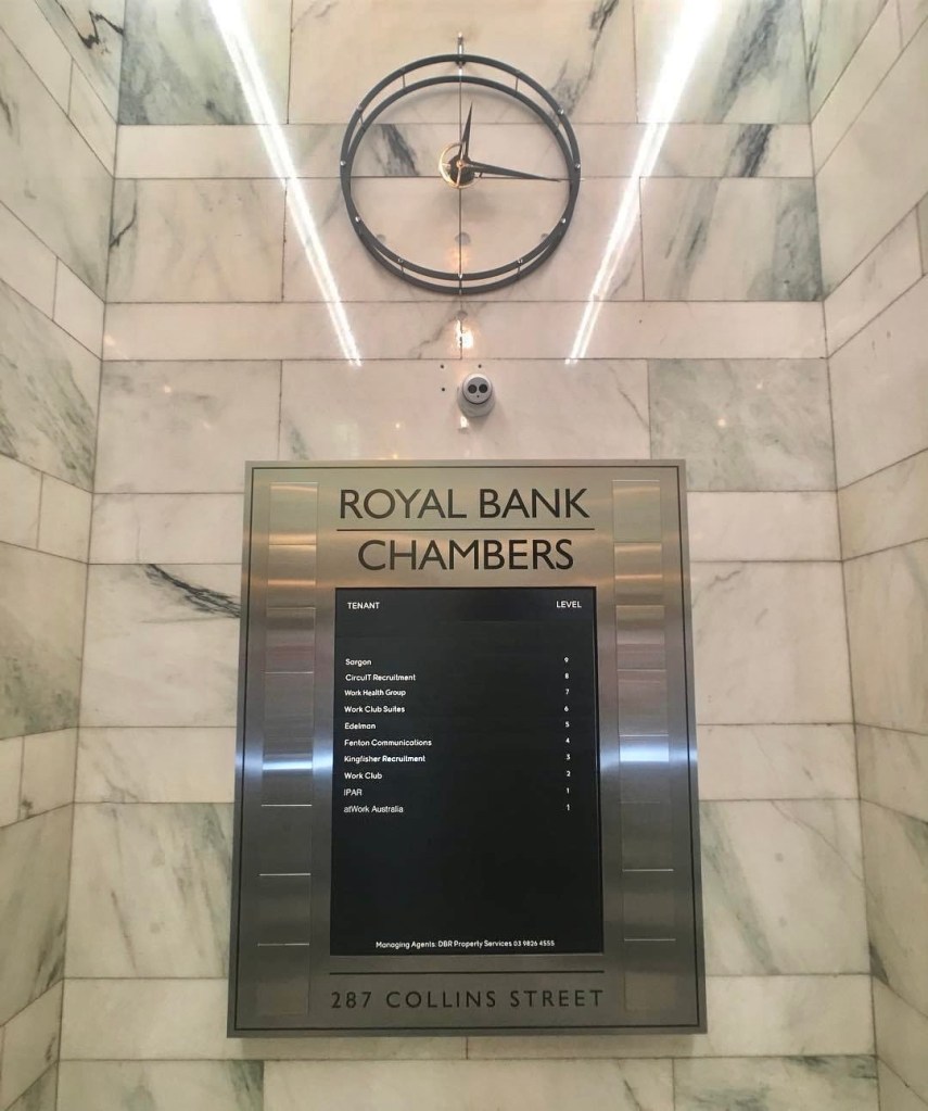 Fabbo office entry to the #ESandARoyalBankChambers, cnr Collins & Elizabeth, #StephensonAndTurner, 1941. Luxe Modern/ArtDeco (#artmoderne?), all #marble and #chromiumsteel. Looked better in 2011 when I took the first photo, didnt need that silly clashing gold light thing, installed in 2017 I think, had to turn the saturation down to get rid of the brown tinge, and it seems they replaced the clock ! Why ? Still looks marvellous though.