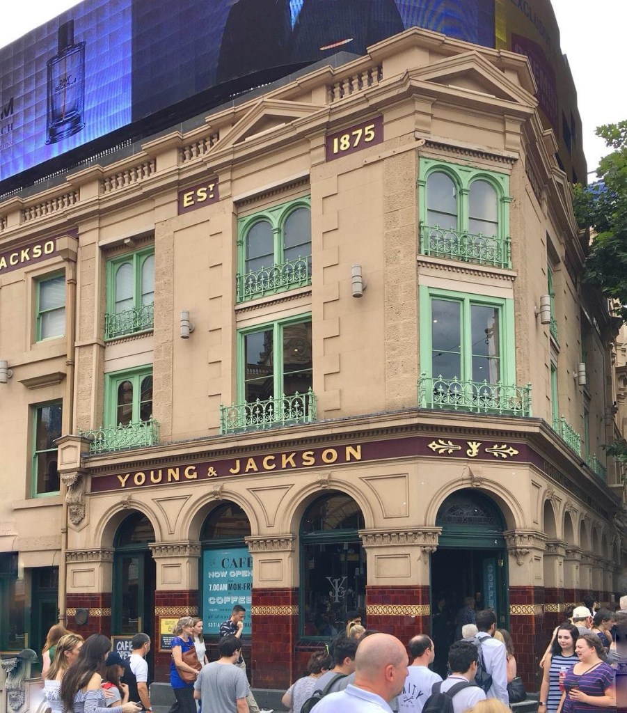 #YoungandJacksons, the most famous #melbournepub. Restored in the 1990s to the colour scheme of the 1920s, that pinky #beige with #eaudenil details, kinda funny looking, but I like it. That period was chosen because that was the last major historic change to a place which is an amalgam of many periods. It’s a remarkable survivor, starting off as a warehouse built in 1853, becoming the #PrincesBridgeHotel in 1861 (last pic) then taken over by Mr Young and Mr Jackson who unusually named it after themselves (though many pubs were known as so and sos railway hotel, so maybe the unusual part is their names stuck). They gradually added the equally old warehouses down Flinders Street, the arches and parapet are 1880s, and the tiles are Edwardian, as is the Swanston Street extension. Love the gold lettering.