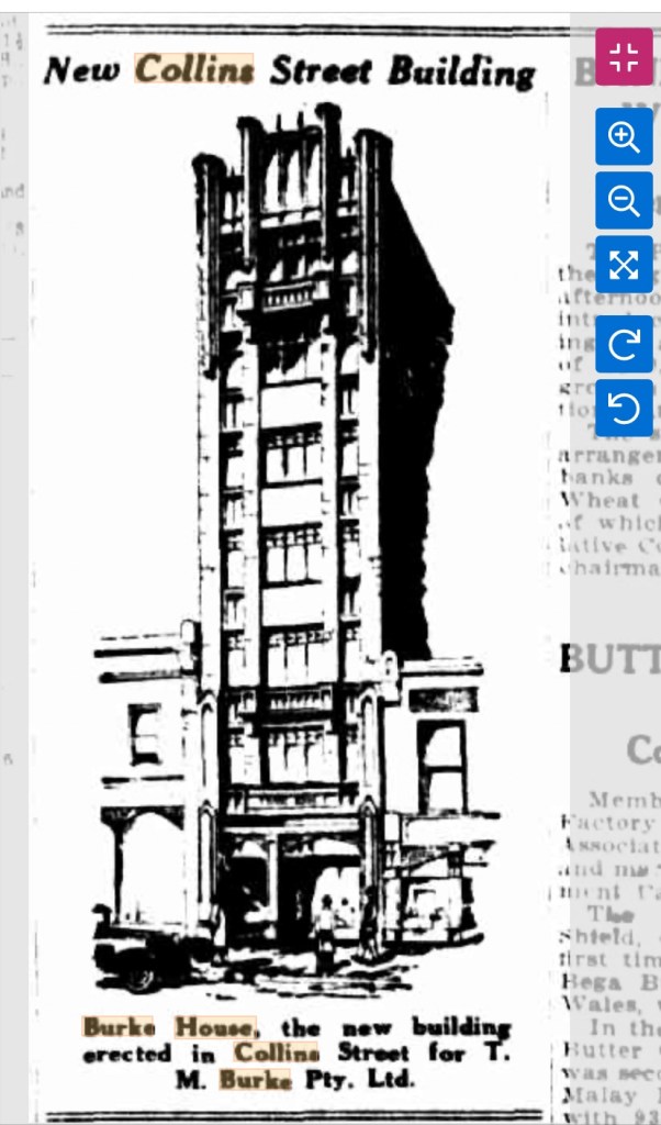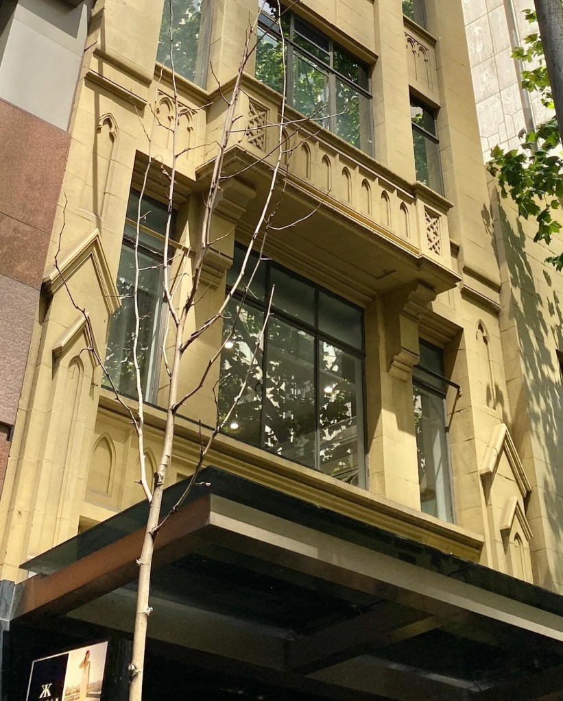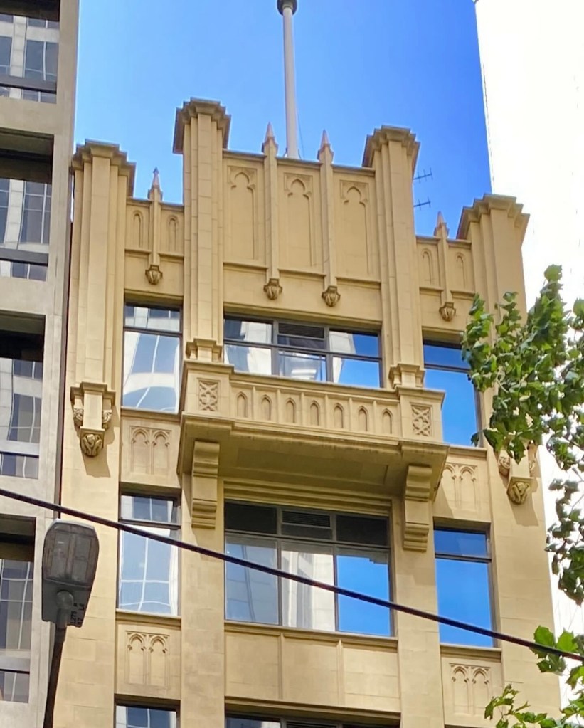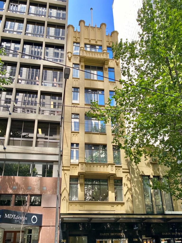 Great bit of stylised Gothic at 340 Collins Street, just off Elizabeth, with Hardy Brothers Jeweller at ground level. One of Melbs many numerous tall narrow frontages, it was built in 1930, for well known developer and financier TM Burke, and was called Burke House (but on Collins – confusing !). Designed in what was described as ‘Commercial Gothic’ by Schreiber & Jorgensen, it’s very much just applied decoration, with more detailing at base and top, all originally in faience of ‘a rich brown colour relieved by panels of a lighter shade’ which might have made it much nicer, but now it’s all painted cream. It got 5 separate articles both before and after construction, but it’s a bit lost amongst larger buildings now. In 1933 Sydney jewellers Hardy Brothers built the little Deco store next door, and at some point took over Burke House as well, losing the Gothic style shop front in the process. It’s still got a separate entrance to the upper floors, where you’ll find a bridal shop, another jewellers, and a clinic that offers ‘facial sculpting’ 😮 Both buildings have a heritage overlay.