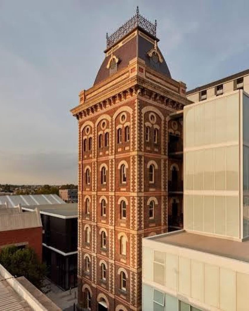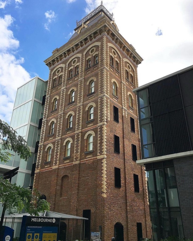 The #brewtower of the #YorkshireBrewery, Wellington Street, Collingwood, designed by #JamesWoodArchitect (son of one of the owners), and completed in 1876, reputedly the tallest structure in Melb at the time. Used to be highly visible, but buildings have grown up around its site within the block, so now it’s more of a discovery – which is nice in its own way. Abandoned for decades, with only the tower, some matching buildings and walls, and concrete silos remaining, high rise development schemes (and developers) came and went for 20 years until #SMAProjects bought it in 2012 and pretty quickly got planning permission for 14, 16, and 8 level towers, in return for restoring the old tower and the other remaining walls (cutting into the stables building though). The height of the towers was way beyond anything in the #CityofYarra at the time (except the stuff near the skipping girl) so it was pretty controversial. In 2017 seems almost piddly. But the new towers do pop up from great distances. And the space around the tower is squeezy, not like the design image. Photos 3, 4 from 2013, and last 3 from real estate showing one of the flats up there, and the attached stair tower.