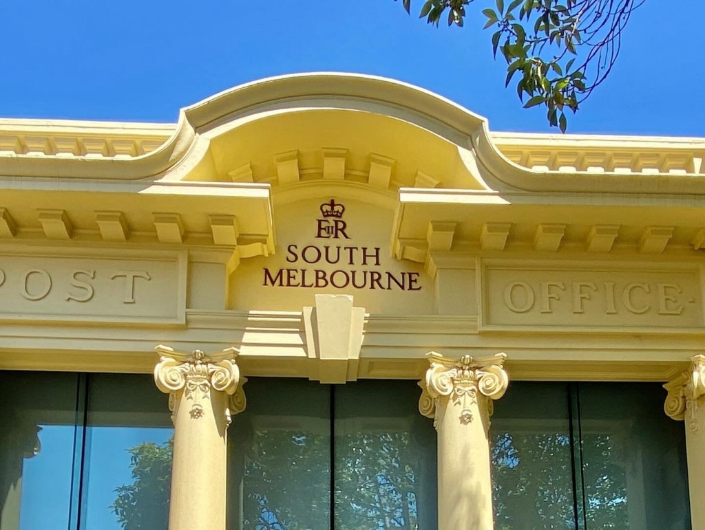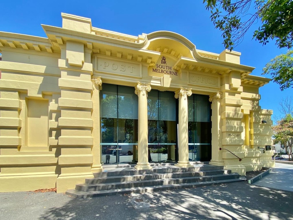 The former South Melbourne Post Office opposite the town hall is a rather bold essay in Edwardian Baroque, dating from 1912, designed by Comm Dep of Interior architect Horace MacKennal. When it closed (in the 90s?) it was reused as a library, and for some time has also housed the @cityofportphillip heritage centre. Pity about the glazed in verandah, but that may have happened a long time ago. It’s on a triangular site, but is L shaped, which means a nice courtyard to one side.