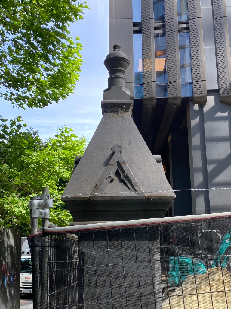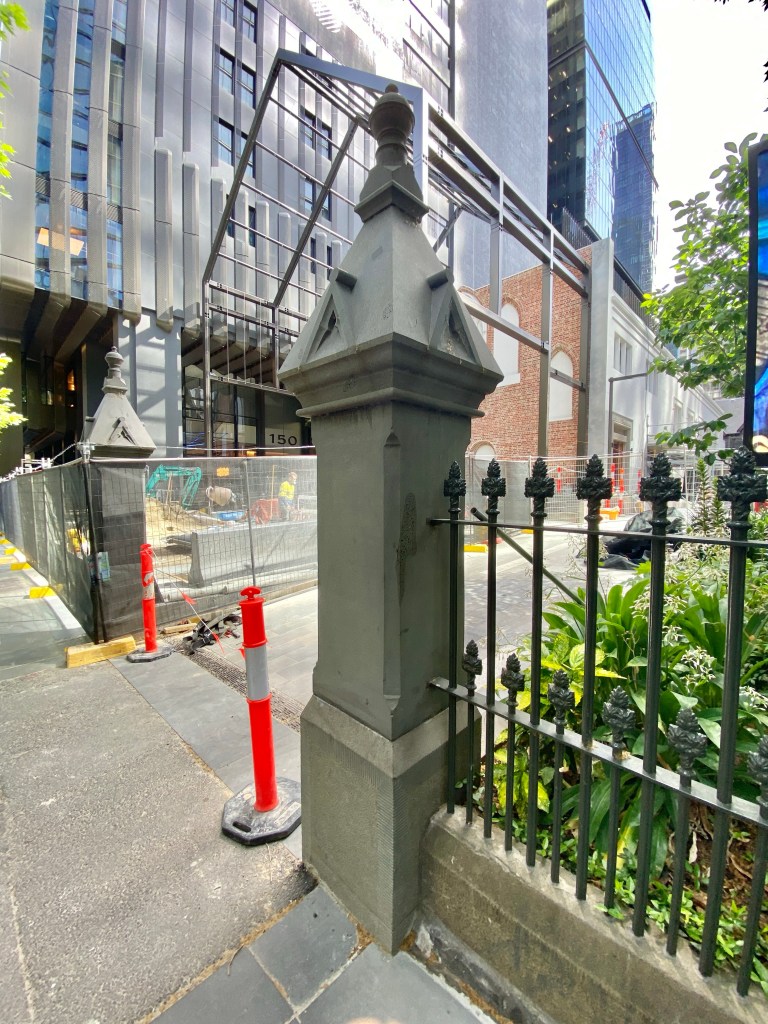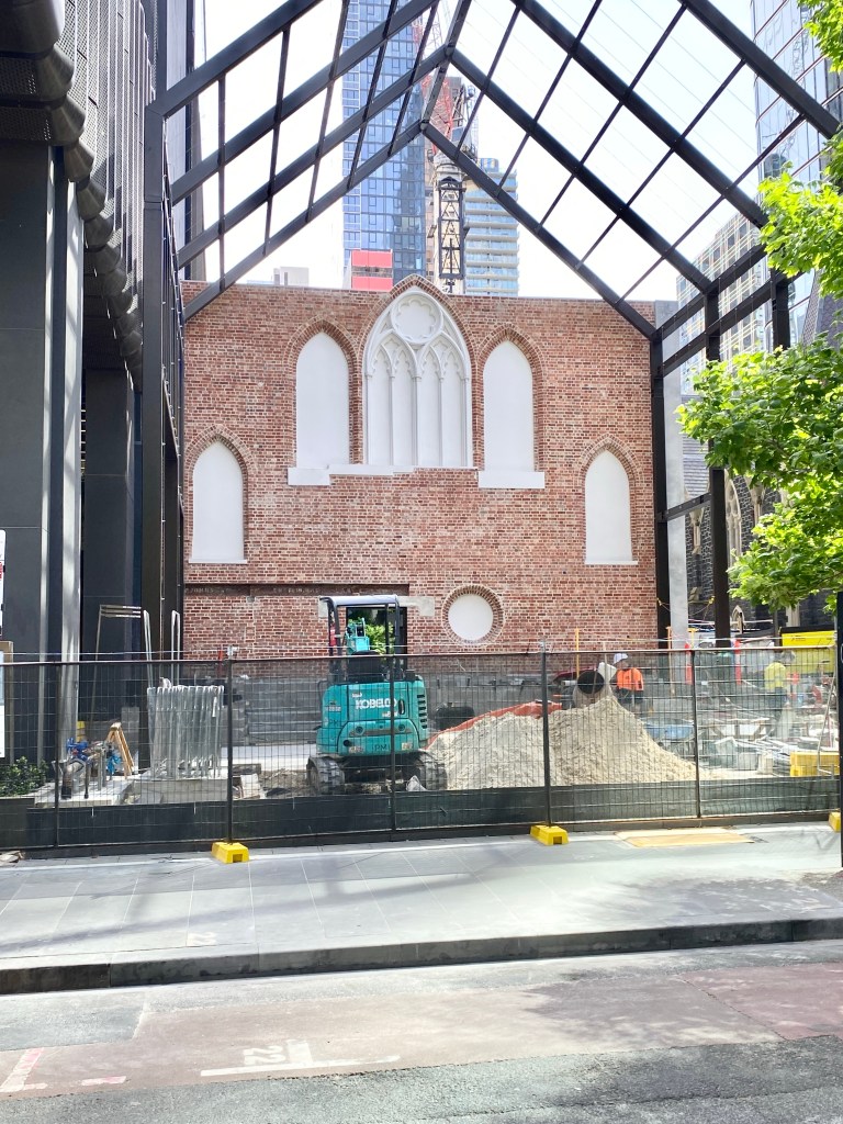 24 May 2019 updated : Marvellous fragment revealed recentlyish as part of the #WesleyChurch development in Lonsdale Street, a real palimpsest of change over time. It’s what’s left of the back wall of the church’s 1888 Meeting Hall, which was covered by the construction of the Nicholas Hall behind in the 1930s. The Meeting Hall was then replaced by a little office building in the 70s, leaving the back wall behind, and now itself demolished. They’re going to keep it, not sure in what form.