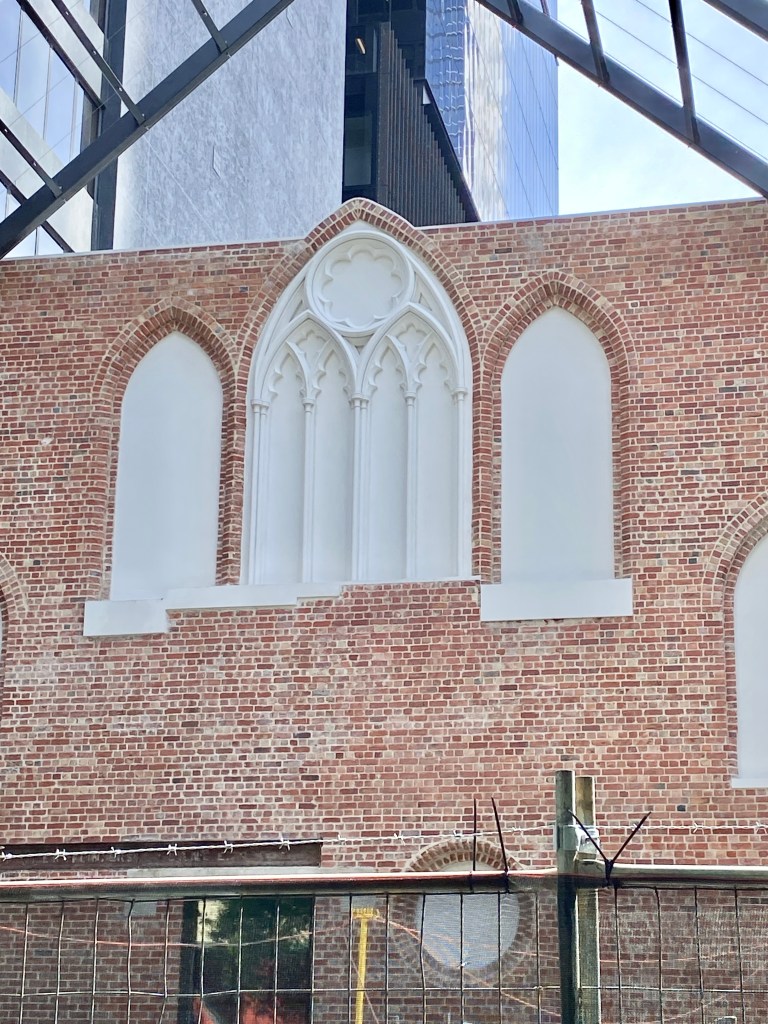 Update : as a wall of a little park, with a framework that I now realise is an outline of the Meeting Hall. Also, @aboderestoration has posted pics of new tracery, so I guess it will look neater and more complete, albeit not an actual window. The hall was going to be a restaurant, but now it’s going to be a co-working space. I’m averting my eyes from the giant office building now looming over everything.