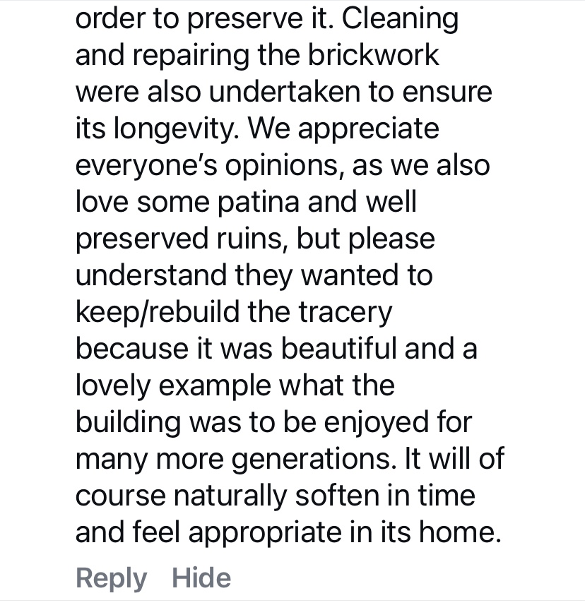 Abode has provided some explanation. They didn’t say not I think actually it was never a window, just some plaster tracery on an internal wall, so it had to be reproduced in something more durable. And the wall had to be repainted to be waterproof. But still, looked better before.