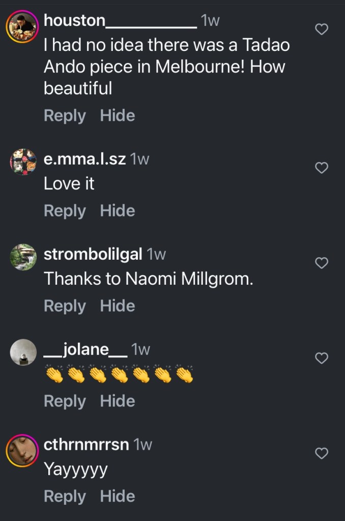 So last night the Councillors of the @cityofmelbourne voted not to demolish the last MPavilion, designed by Tadao Ando, in the gardens opposite the NGVI. And it is really quite a beautiful piece of architecture; severe concrete walls enclosing a calm space that’s half reflecting pool, with a huge circular roof floating above. I can see why they had issues though, it needs 24hr security to avoid bad behaviour out of sight, and to scare off the taggers, and the pool will need maintenance – but Naomi Milgrom, who was behind and partly funded the 10 pavilions over the last decade, is going to pay for all that for 5 years at least, as well as programming events. There was also a campaign to retain it (eg @preservethepavilion), a petition of 2500 names, and many expressions of support including from Ando himself. It’s nice to think I can go any time and just sit in there (if there’s a spare seat). I do wonder if many outside the architecture and design professions care about it that much, but perhaps they do !