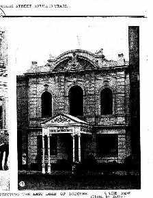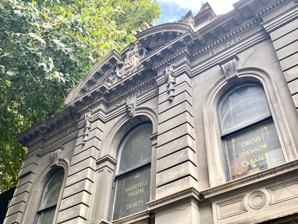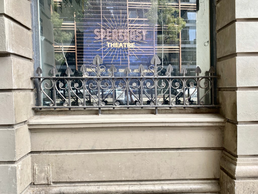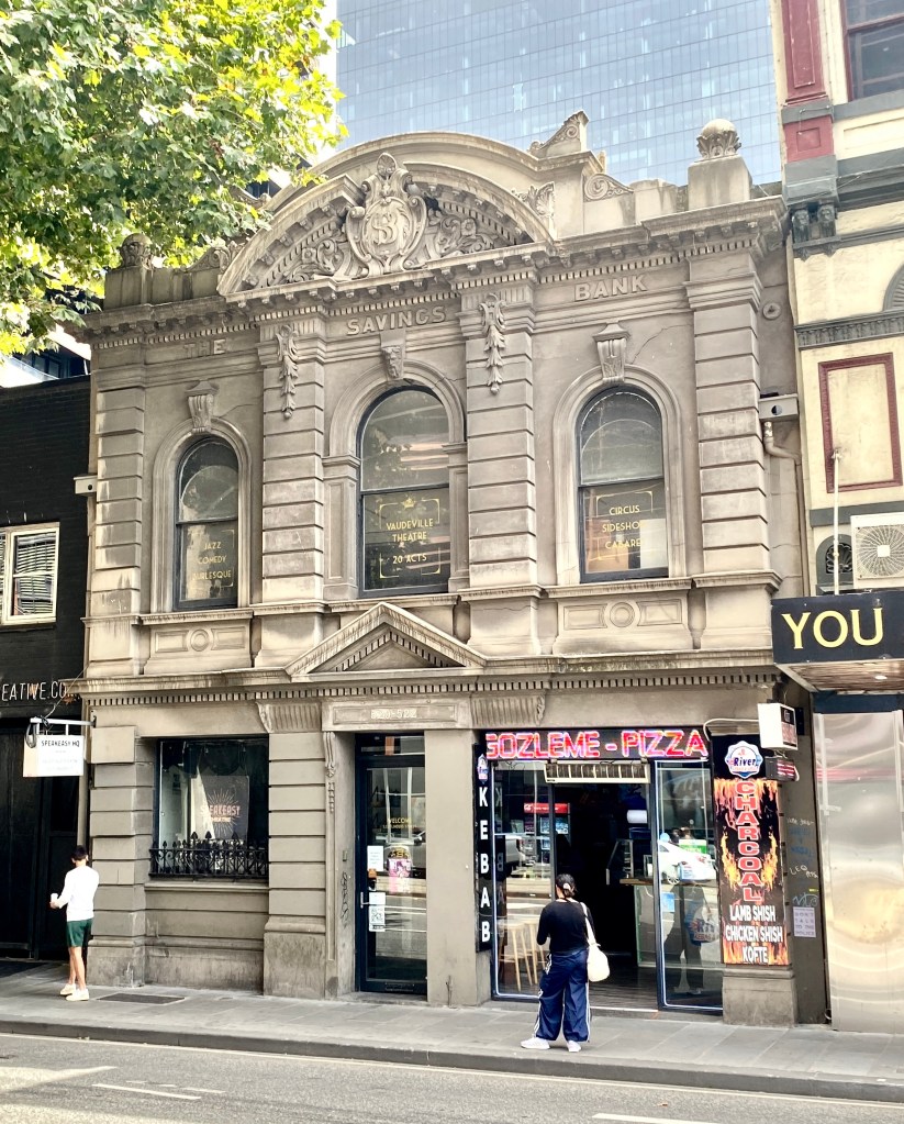 This fabulously overwrought facade on Flinders Street near King Street is a 1911 do-over of an earlier warehouse for the Savings Bank, the State Bank in its early days of expansion. This one, presumably here to cater to the maritime /warehouse trade, was designed by Claude E Merrett, in fruity Edwardian Baroque style, with that broken arched pediment filled with detail. It originally had a jaunty little verandah too. Apparently the warehouse had a vault that the bank reused. One part now a shop, but otherwise very well kept, painted at some point (pic 5), now unpainted. And there’s some notable interior features too – the bank chamber was double height, lit by skylights, and the fairly elaborate coffered ceiling is still there, though the space was subdivided into up and downstairs by 1923. The upper space is still spacious, and it’s been a Cabaret venue Speakeasy for about 10 years. Their website has quite a detailed history! Before that it was a gym, that’s the first interior shot, from a sale ad. Other interiors from Speakeasy. The building is heritage listed but not the interior. Blurry old photo Weekly Times 1912.
