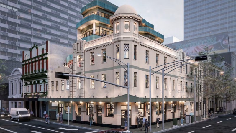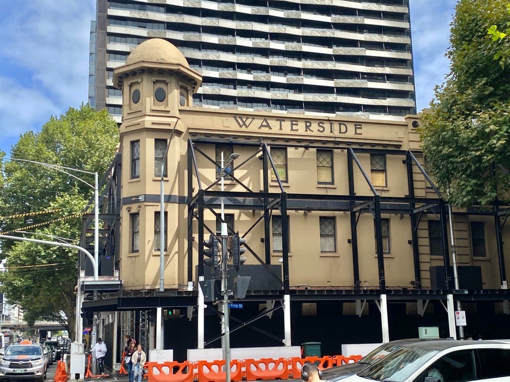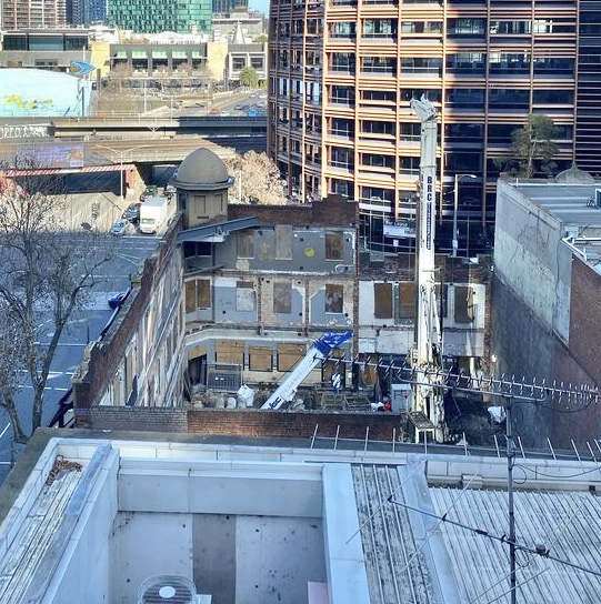😡 yet more facadism, of yet another corner pub, this time the 1925 Waterside Hotel on Flinders Street. It’s still going to be a drinking venue, but of completely different character to a pub, with a central courtyard and rising floors of perhaps private bars /dining rooms in one corner, all with green edged balconies, which is nice, but ….. The 2020 CBD heritage guidelines say that the ‘front of principle portion’ should be retained, which has immediately been misinterpreted as if it ‘looks like’ that much is retained, then it’s ok. And in this case right behind the facades will just be narrow balconies, so you’ll look through the windows from the street into more or less open space, so being just facades will actually be quite obvious. There wasnt a lot of notable stuff inside, though possibly including the bar itself, now gone, and a range of doors, stairs, cornices, separate rooms etc, clearly showing it was an old building. Which it wont be very soon, it’ll just be two walls. The Waterside famously opened at 6 for dock workers. Interiors from their FB page, old photo 1960s @cityofmelbourne collection.