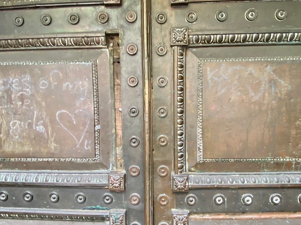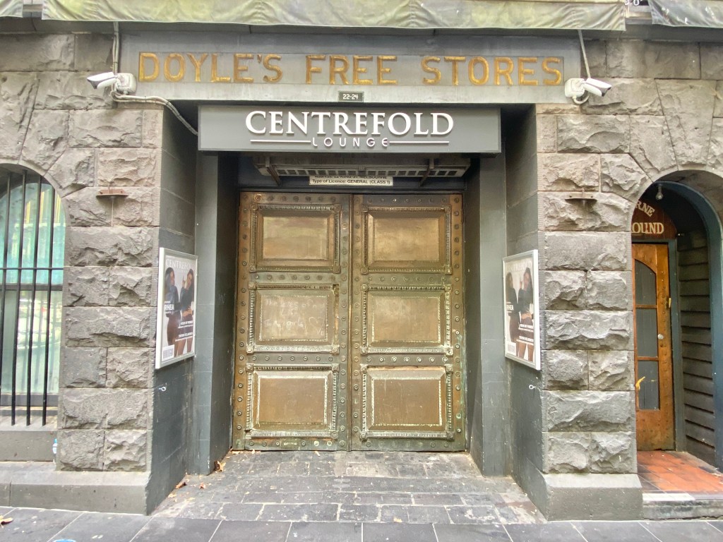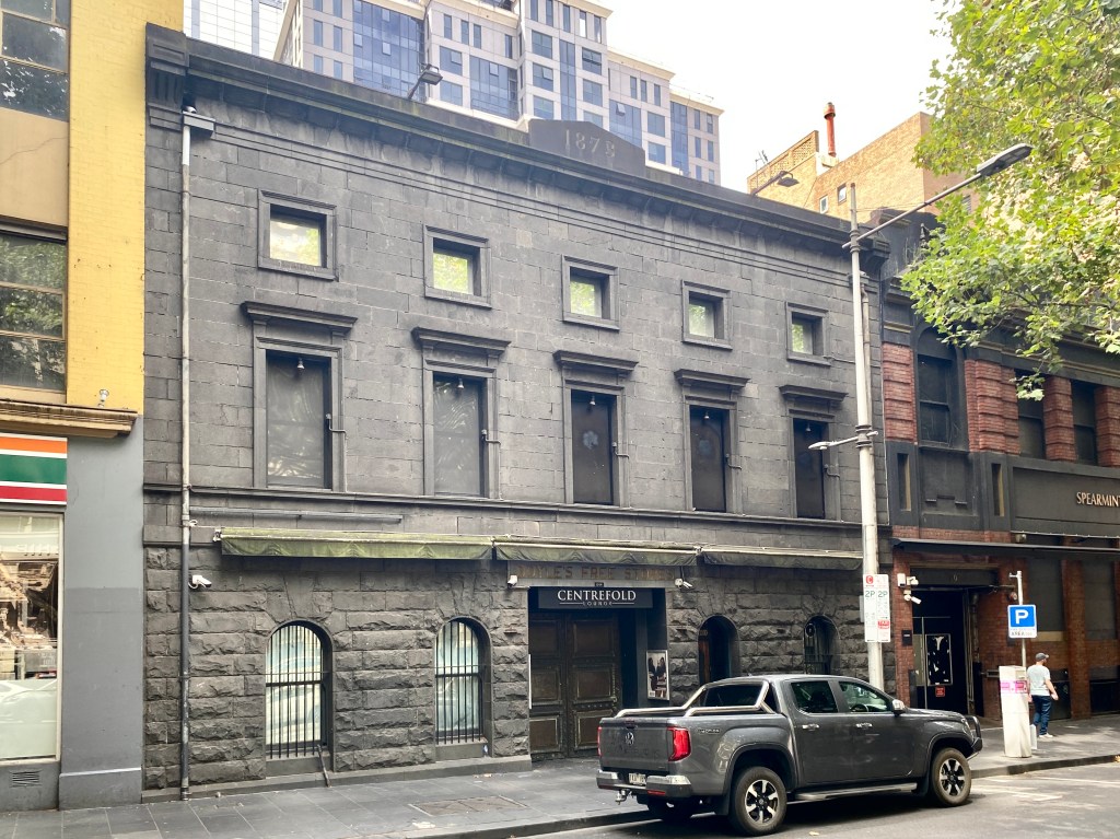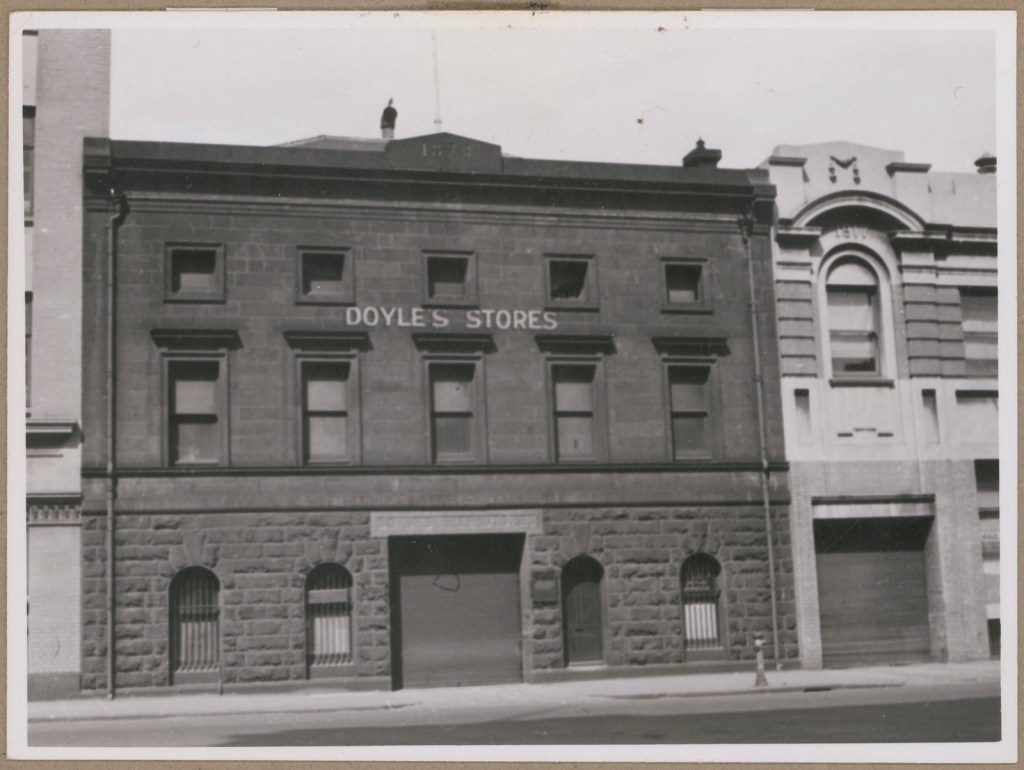 A very fine Renaissance Revival style facade in King St near Flinders, with typical rusticated base, and prominent first floor windows, all in carved bluestone. A style common for warehouses (indeed many building types) in the 1850s that just carried on, this one designed by A L Smith in 1873 for Zander’s Bonded stores, a business run by Cecilia Zander for 20 years after she became a widow. Later it was Doyle’s, gaining the nice bronze doors perhaps in the 1920s. then a big fire in 1954 leading to a completely new interior (an early case of facadism!), and it became a nightclub in 1978. This whole strip of old warehouses became nightclubs about then, helping to preserve them, and most still are. Listed by Heritage Victoria early on, in 1978. B&W image @library_vic, 1949. The first floor sign was painted on.