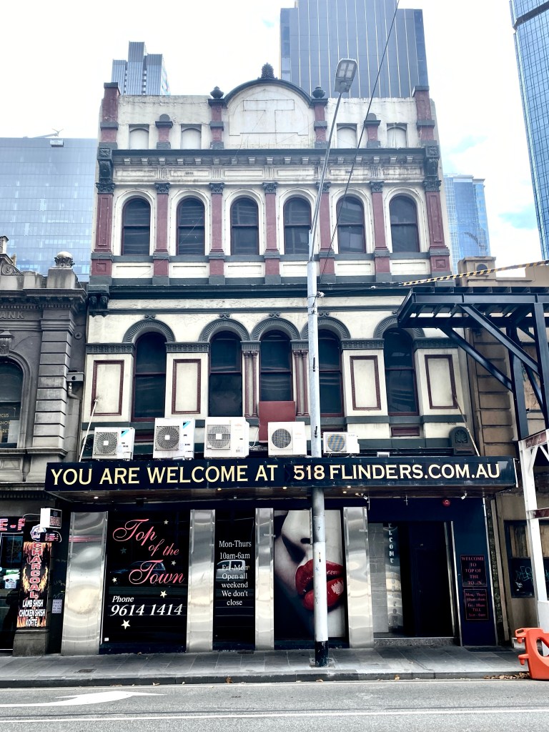You probably know this place as The Top of the Town, a brothel in Flinders Street near King Street – it’s a fairly nice building too, with a bit of a history. It was built in 1880 as Coffee Tavern No 2, one of the first of the ‘coffee palaces’ in the city, and the second by this company, the first being in Bourke Street – the promoters thought to do good by providing a place of relaxation, with a coffee room, billiards and smoking rooms, but no alcohol, right amongst the wharves warehouses and pubs of an area with a hard working low wage area. The fine building was designed by Lloyd Tayler in Renaissance Revival style. I don’t know how successful it was, but like many of the other Coffee Palaces (mostly a bit grander than this one) it closed after the depression of the 1890s, becoming a warehouse in 1897. Nearly a century later, it was renovated as a brothel in 1990, when it faced the now King Street overpass, dem in 2005, but now we can all admire it in its jaunty colours (above the annoying row of aircons).