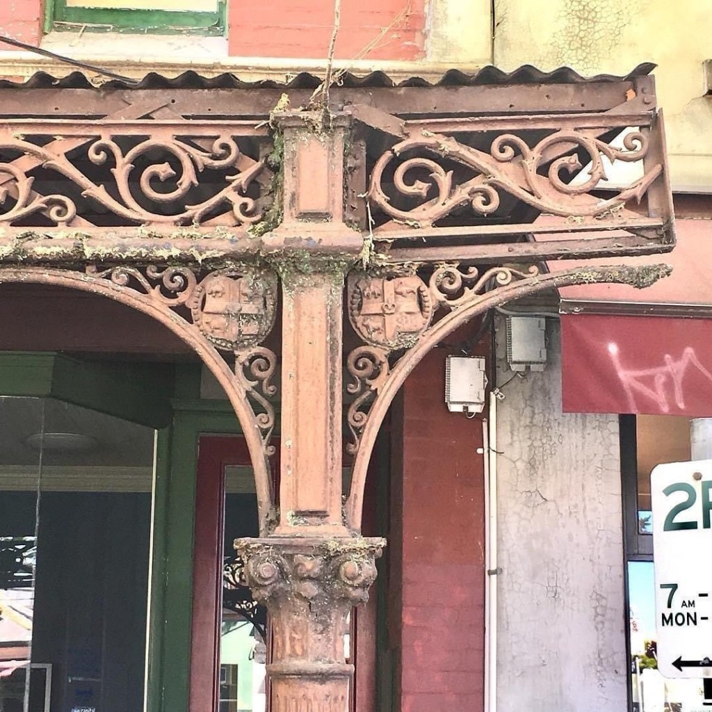 Pretty sure this is an original #CastIronVerandah rather than a later reproduction – the bases now lost under extended pavement, and basically it just looks too old and wonky to date from the 80s when the CofM funded reproductions. Interesting that A. it survived the wholesale removals of the 50s, and B. has posts slightly inset from each side. (On the other hand it has the CofM coat of arms that was part of the standard reproduction verandahs, but must also have existed in the 19thC, so I’m sticking with my ‘it’s original’ theory. I think there’s other originals in the street).
