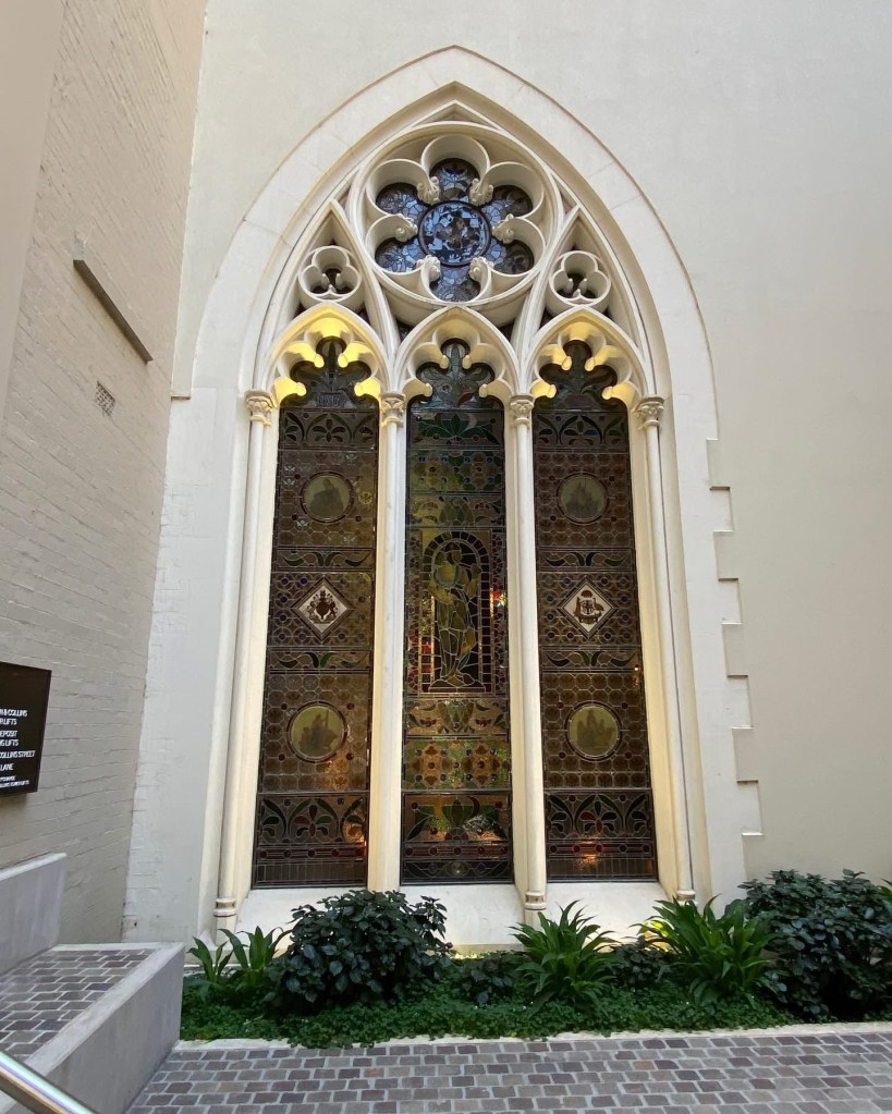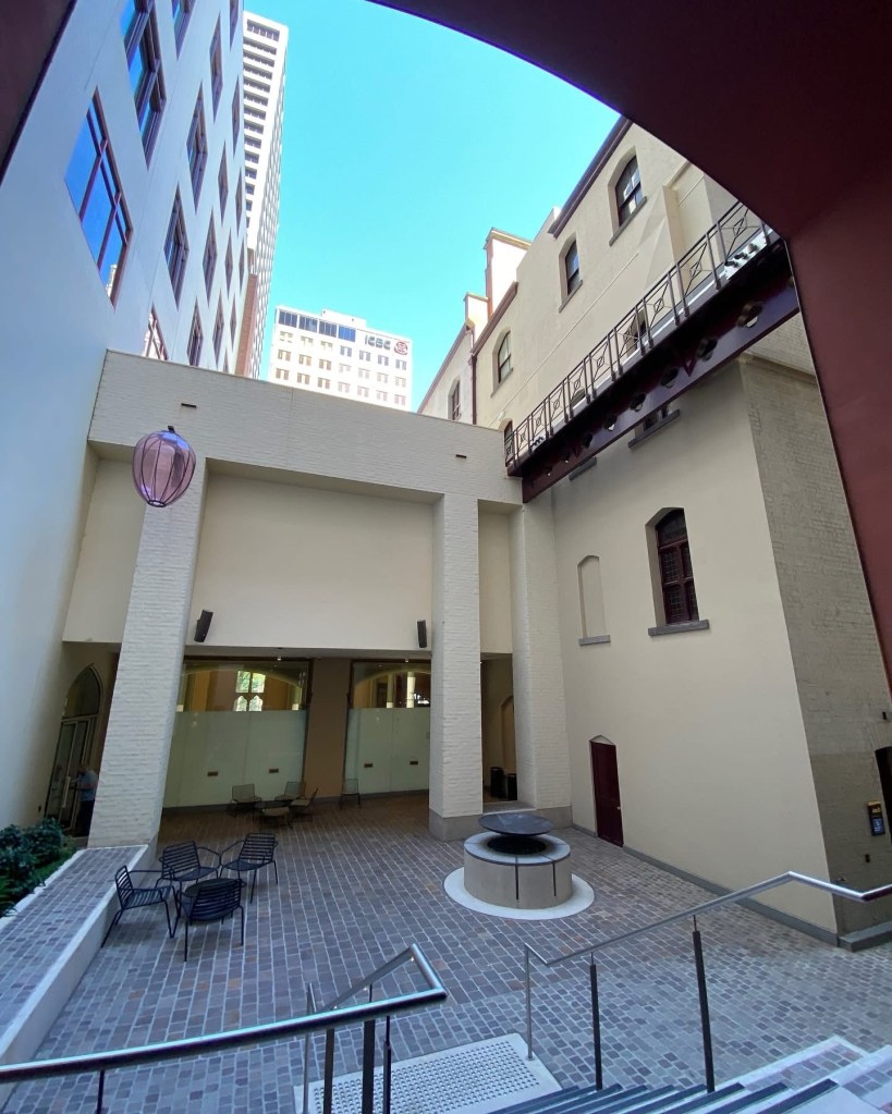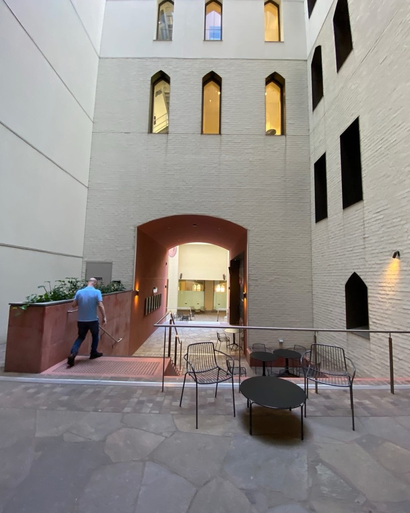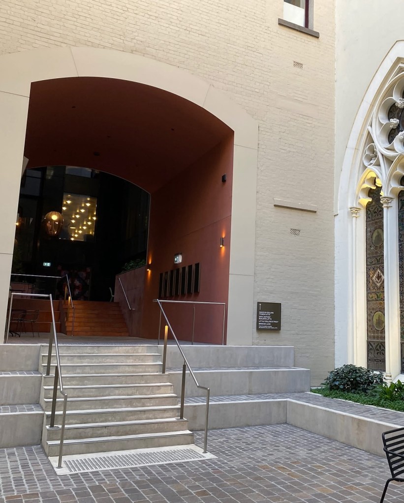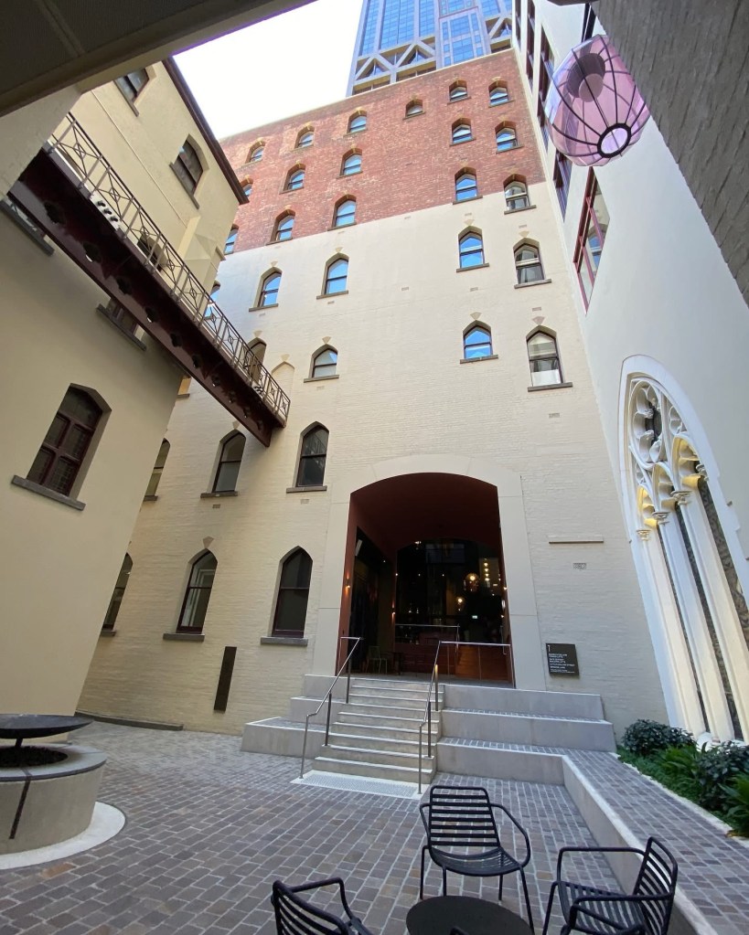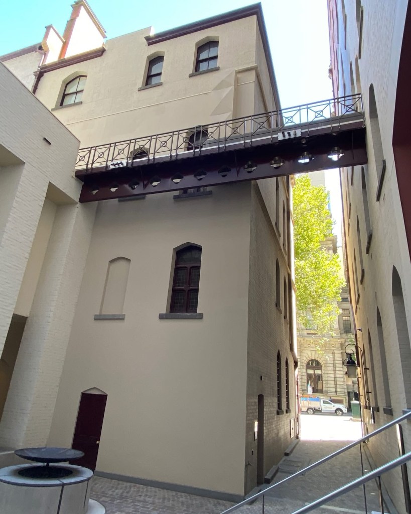 The newish courtyards behind the 1887 Gothic Bank in Collins Street, by @kerstin_thompson_architects completed mid 2021, a bit bare but pleasant enough (and much better than before). It’s a series of spaces carved out of the rear parts of the bank and the 1899 Safe Deposit building in 1992 in order to create a (convoluted) way through to the ex-ANZ World Headquarters tower on Queen Street from Collins Street. It was done in a pretty tacky pseudo Victorian style by @peddlethorparchitects (who also did the daggy tower itself). The new version draws inspiration from from Venice (which I now realise might be via the partly Venetian Gothic of the bank), designing them as ‘campiellos’, open to the sky, and using natural materials, notably cobblestones and ‘stucco lustro’, a Venetian plaster technique. The only thing is they’re not as busy as a square in Venice, and they’re a bit cool in winter to linger long. But nice. The new tower lobby is richly impressive but surprisingly dim. There was a cafe at a lower level, didn’t see exactly how to get to it, was that La Rue ? My pics Feb 2023, and before pics taken Jan 2019, after I heard it was all going to change.
