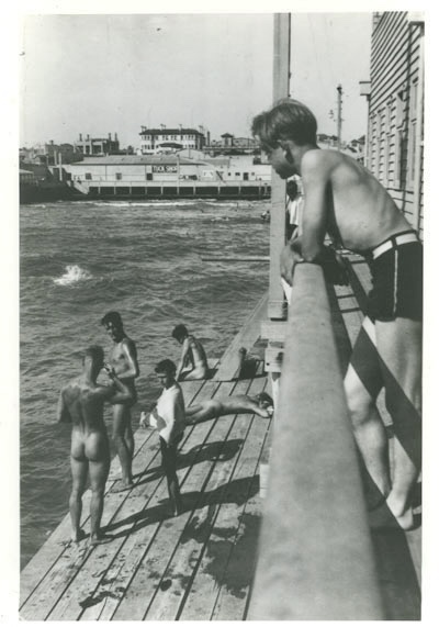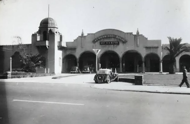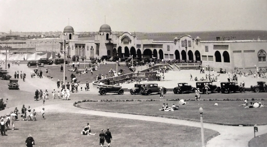 The St Kilda Sea Baths, probably not long after it was built in 1931, with the men’s section on the right, and the smaller women’s on the left. The domes are still there but the bold Spanish arches of the right hand side were lost a long time before it was demolished and rebuilt in c2000. There’s not a lot of good photos of it, but there are 3 surprising ones of what it was like inside in the 30s and 40s in the men’s at least – they swam nakked! And sunbaked – plenty there with no tan lines. The photographer managed to get shots with only bums, or rather took many and chose the ones without any wedding tackle. Pic 1 via reddit, 2 found on my computer, 3 old postcard, 4-6 from Victorian Collections, 2 of them held by the St Kilda Historical Society.