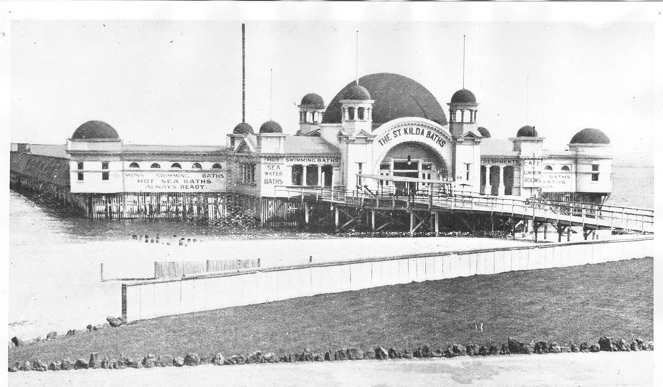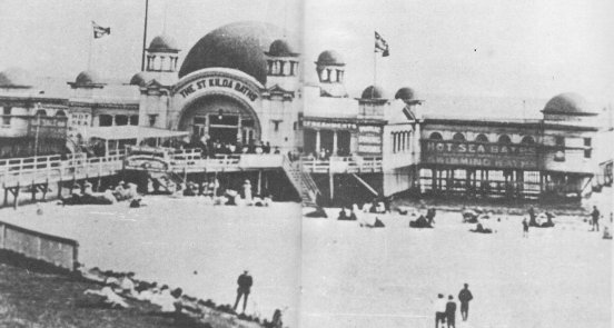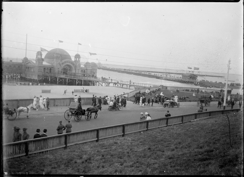 The fantastical St Kilda Baths, a collection of exotic domes hovering in the sea. Id seen images of this ages ago, the first time in Maggie Fooks dreamy 1987 short film Pleasure Domes, but not much since, and these are all I could find. It was one of many sea baths built on the foreshore starting in the 1850s – at one point there were at least three of them, but they regularly got damaged in storms or replaced or renamed. This one, simply called St Kilda Sea Baths, built in 1906, was by far the grandest, and was designed by Nahum Barnet, who did a lot of creative Edwardian era things, but I didn’t know about this one. They only lasted 20 years, the domed part destroyed by fire in 1926, eventually the whole thing was replaced by the Moorish /Spanish one in 1931, itself demolished and rebuilt in the late 1990s. High res images and postcards from the State Library, others Victorian Collections and St Kilda Historical Society.