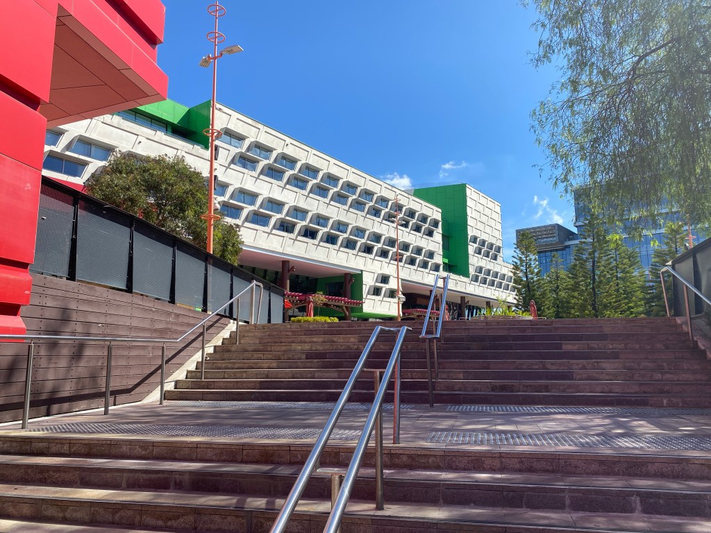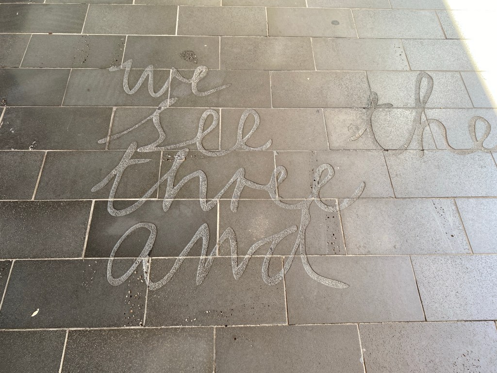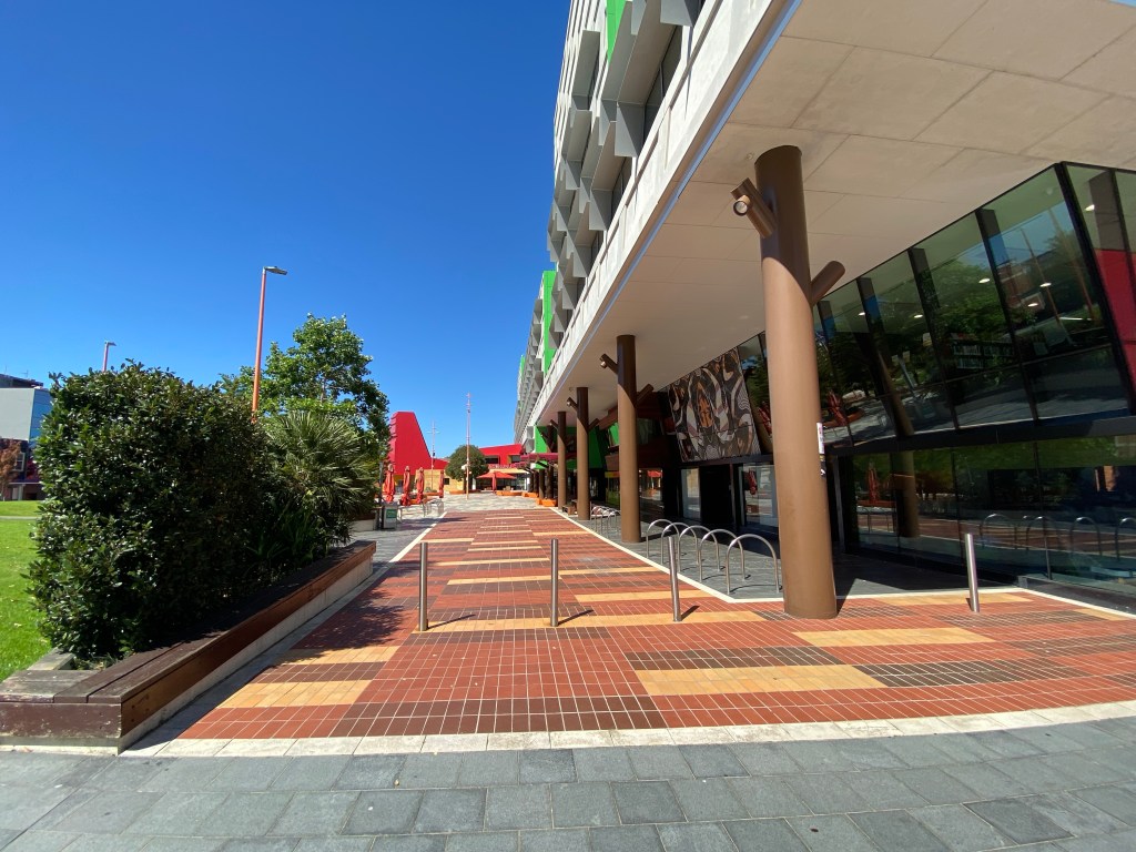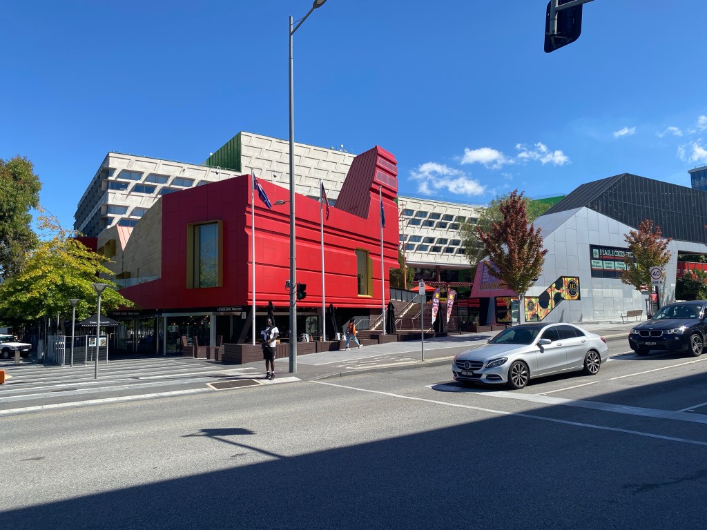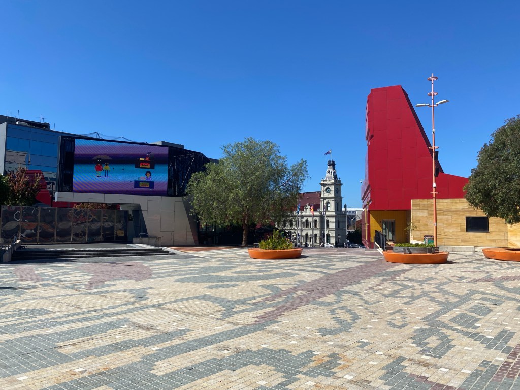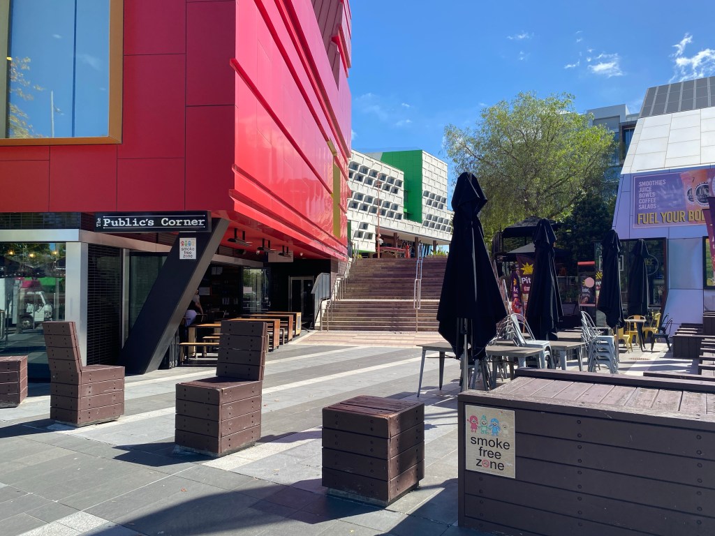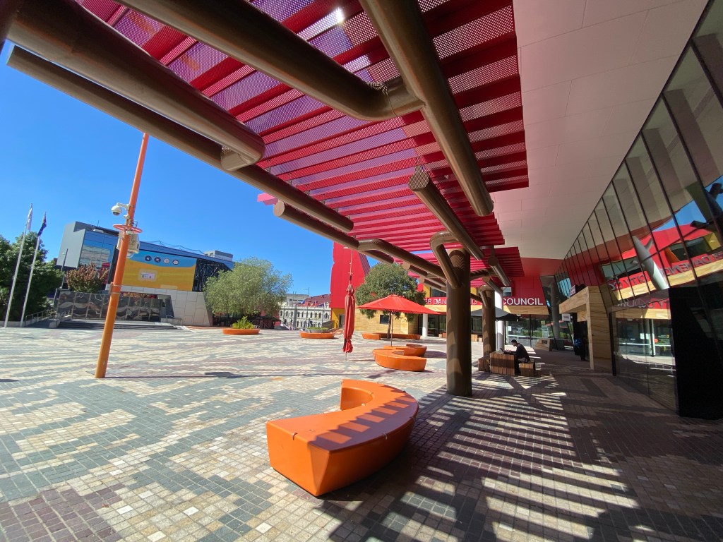 Harmony Square is the name for the public plaza that’s at the heart of the Dandenong Civic Centre – it’s pretty much a miniature Fed Square, but with somewhat more attractive public spaces. The open space has similar earth toned patterned paving, with words etched into a part, and it focusses on a stage and big tv screen (which had a rather loud video about vaccinations), and like Fed Sq is empty without some programmed event. But on the other hand there’s cheery orange benches, a patch of trees with chairs and tables under, and the upper corner is grass. The whole thing is rather divorced from the main drag though, being up some stairs, but on yet another hand, you wouldn’t want a big empty space sitting on the main street- in fact it’s got a cafe and some shops down there. I liked it, looks attractive, but really we don’t know how to use plazas in Melb, most people just want grass and trees, which makes it a park.