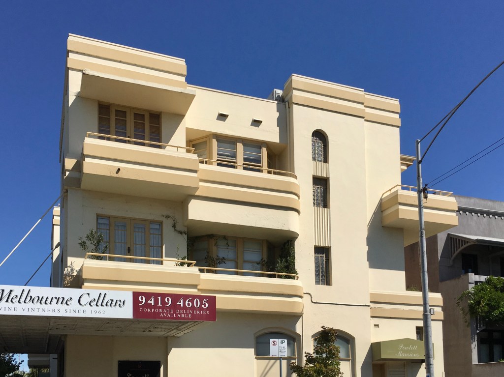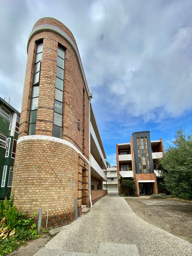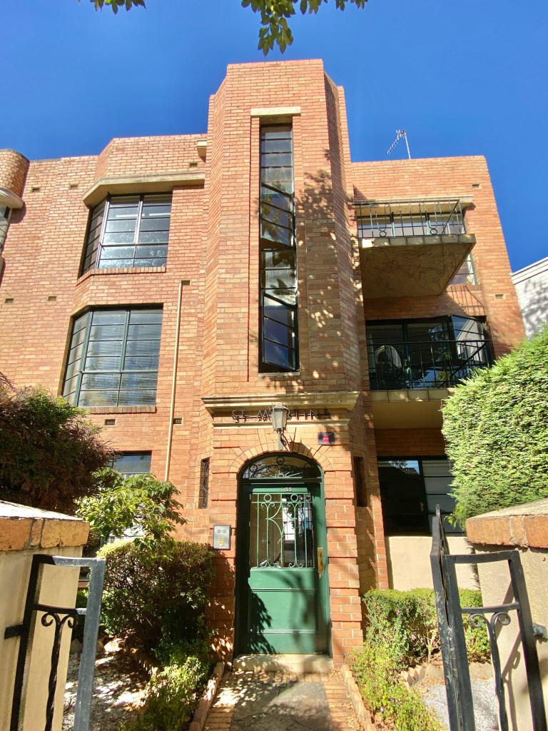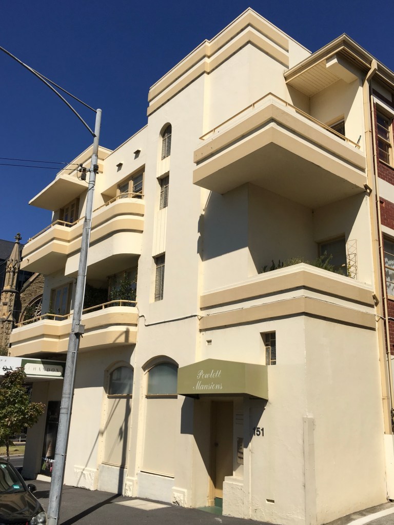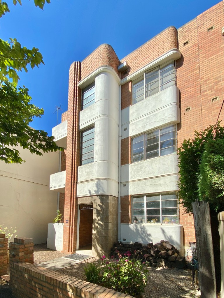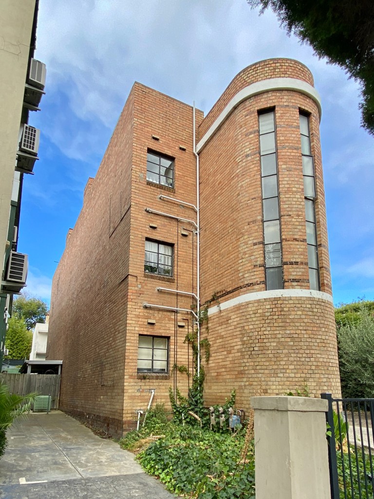 Very striking Art Deco flats on the corner of Powlett and Hotham Street, East Melbourne, which I snapped in 2017- and then learned it was yet another project in that small suburb by IG Anderson; actually this was the first, built in 1934, he then went on to do 8 other small blocks and the 5 blocks on Garden Avenue, all by 1941.