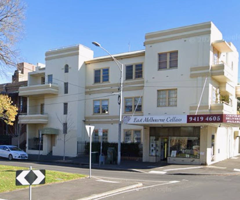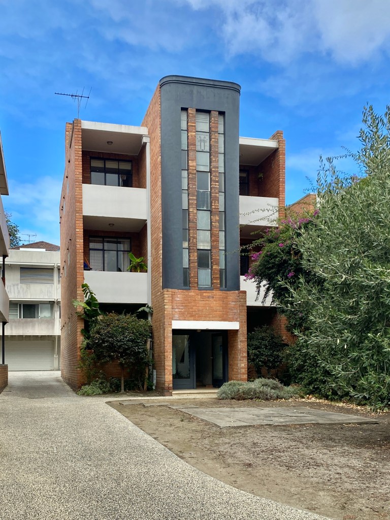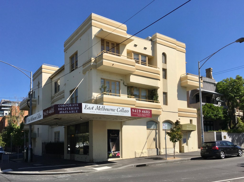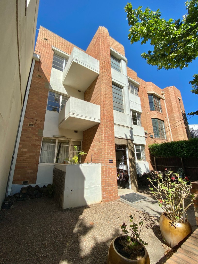 Nice but of Art Deco at 53 George Street East Melbourne, bully 1940, and designed by IG Anderson. And then in 1942 right next door he designed another one, St Martins, in a more Georgian mode. Anderson did a lot of flats in East Melb around 1940, including 5 blocks in Garden Ave just round the corner. There was a boom in flats, often small, just as the war started, before rationing. This block at 52 George St seems to be one owner still, found some rental ad images, I think it’s just one 2 bed flat /floor.