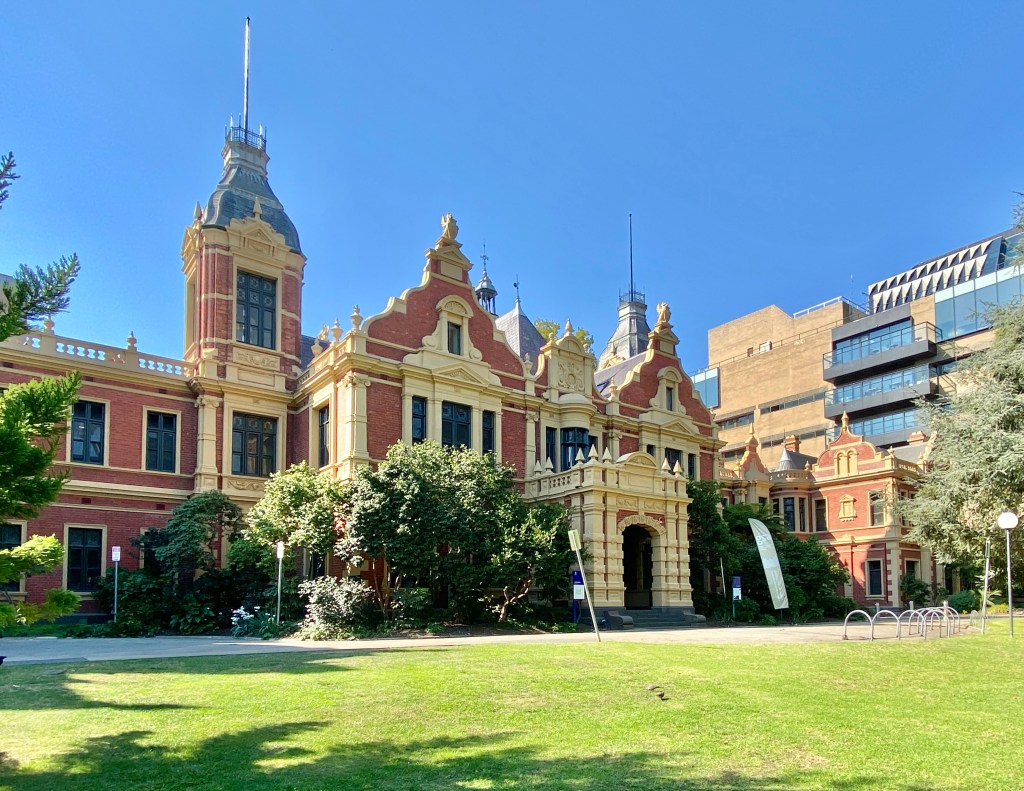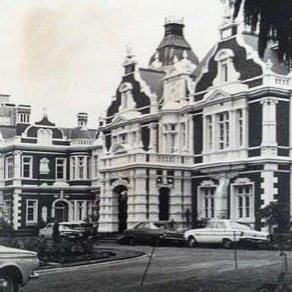 Looking impossibly picturesque- the former Melbourne Teachers College, now part of #MelbourneUniversity, and called the #1888building (even though it was built 1889-91). By far the most OTT example of #QueenAnne in Melbourne, with a dash of Dutch Renaissance. Including the fence and gates. Architect #GBHAustin for the Public Works Department. Impossible to take a photo of the whole building – it’s very wide, lots of trees and faces south to boot – but I found an aerial, and a photo from 1930, with graduating teachers, and 1958. Also it seems the college opened only for a short time, closing in 1893 due to the 1890s depression, not reopening until 1900. Fantastic stair inside.