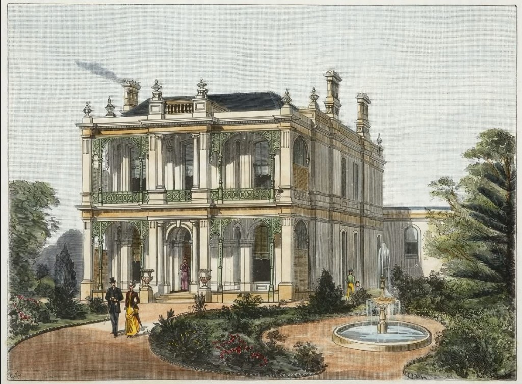 This grand house once stood in Burnett Street, St Kilda, but was demolished a long time ago. Euro-Reko was built in 1866 as the residence of Peter Davis, previously a Lord Mayor of Melbourne, taking up a large number of allotments. Designed by Joseph Reed of Reed & Barnes, I was surprised to see the date, because it’s earlier than his Independent Church in Collins Street (1867), or the first stage of Rippon Lea (2nd pic) from 1869, which I thought the earliest fully polychrome brick house. It lasted a good while, but was one of the first mansion estates to be demolished for 13 much smaller house lots, somewhere around 1910; many of the houses must have been built together since they’re variations of each other, mostly still there, and quite nice. I thought the name maybe Scottish or something, but it comes from the aboriginal word Euro-yroke or Youruk, possibly referring to the red grinding stone of the St Kilda area, or just the area. St Kilda footy club has adopted the name for this years round, spelling it as Euro-Yroke.