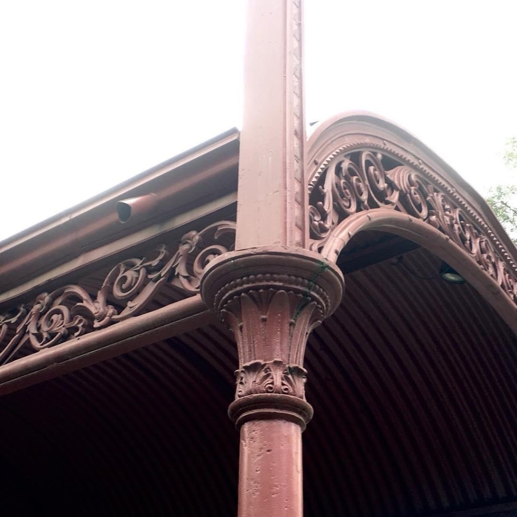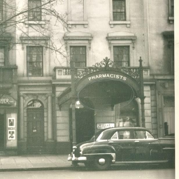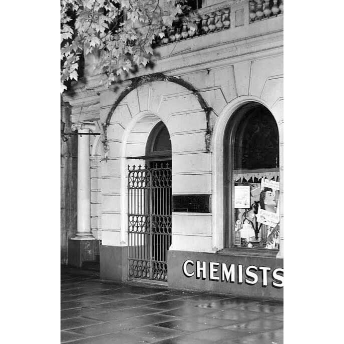 Oggs Chemist, in the #ParisEnd of #CollinsStreet – a long story, but interesting ! The terrace of #townhouses was built 1855, and Oggs was established in 1872, and at some point added a very nice #castironverandah / porch thing. Then in 1954 the @cityofmelbourne edict from 1951 that all posted cast iron verandahs in the CBD should come down was reaching its June deadline, this was the last one – and it was almost saved by a lot of public fuss, which in the end meant it wasn’t completely lost, but taken by the newly established #UniversityClub at #MelbourneUniversity to attach to their rooms in the one surviving Professors House on campus, built 1885 (but they lost the best curly bits on the way). Oggs then built a modern shopfront, and then 20 years later the building itself was demolished in 1976 to provide a forecourt for #NauruHouse (just now filled in again), and another fuss ensued – firstly to not demolish it, and secondly to save the 1870s ? 1900s ? huge cedar cabinets and draws etc still inside – which were indeed saved, and taken by Museums Victoria, though they had no online record till I emailed them a few years ago to ask well did they actually have it, to which they said yes, phew ! But they’ve never been displayed, and I couldn’t find any photos.