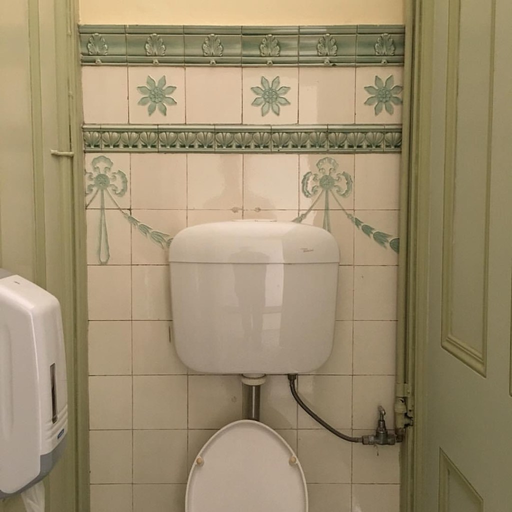 A #heritagetoilet in the 1910 #MelbourneTownHall adminstration building. Love the very bold swags in the tiles. I’d guess the cistern was originally much higher up the wall. The building was designed by Grainger, Little and Barlow. John Grainger had a long career, from the 1880s to the 1910s, and was the father of Percy Grainger.