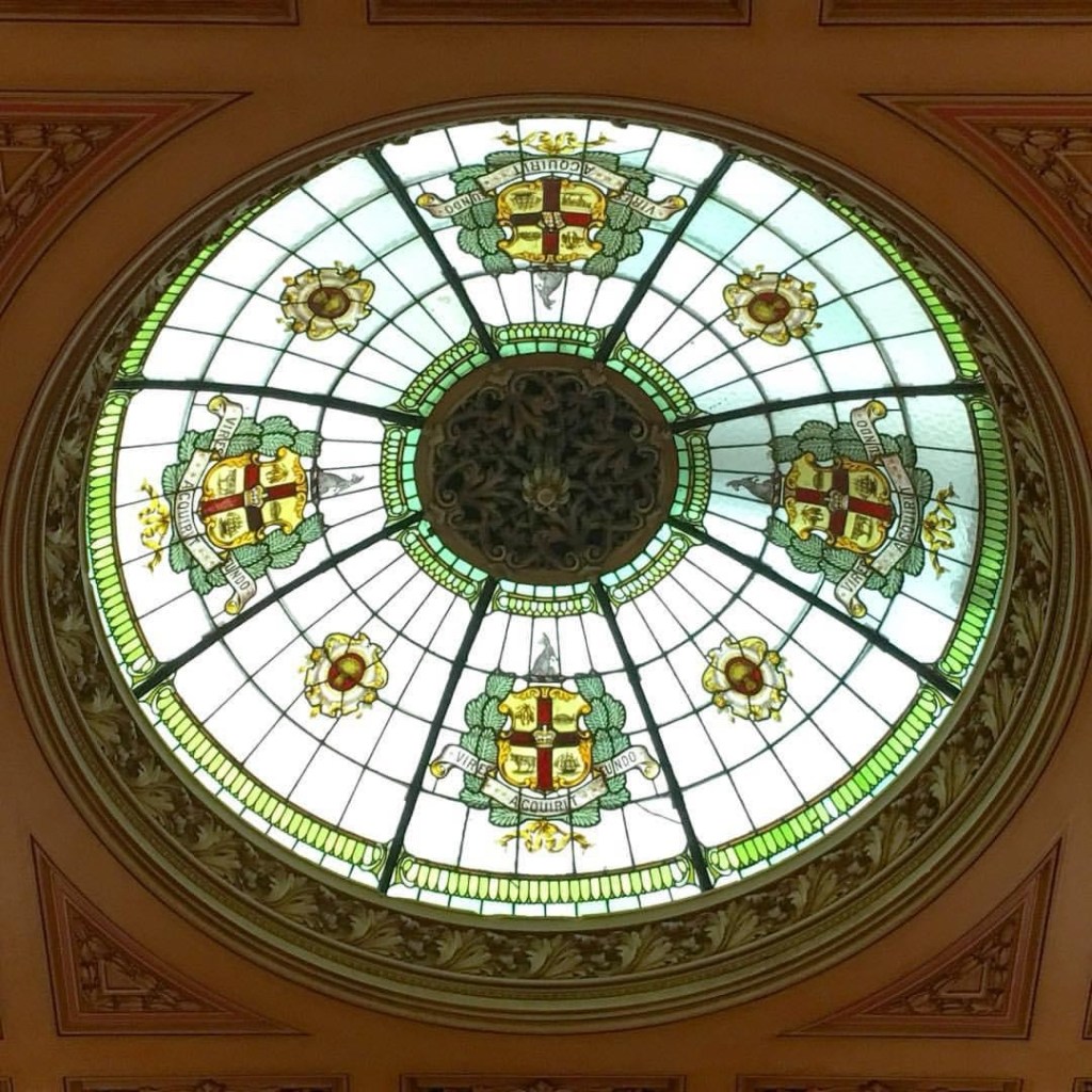 The fabulous #MelbourneTownHall #CouncilChamber, 1910. Look at that #plasterwork! With lots of gum leaves, hard to see though. In fact hard to see anything, it’s so dim, only natural light is through the skylight, and #leadlight #windows into light courts. And loads of dark polished timber too. Designed by Grainger Kennedy & Little The HV citation says EJ & JJ Clark designed the exterior, but can’t find any evidence of this. They may have taken over the contract administration – John Grainger had just returned from Perth, and was in and out of good health, due to excessive drinking and syphilis (!), and was only 52 when he designed this.