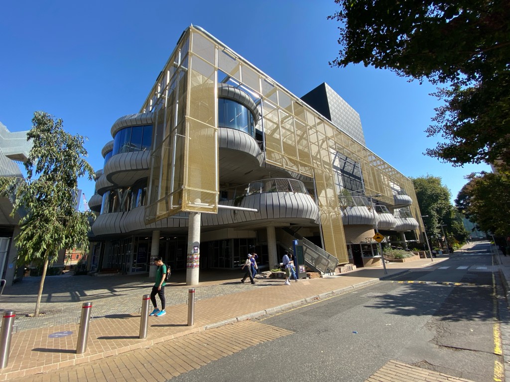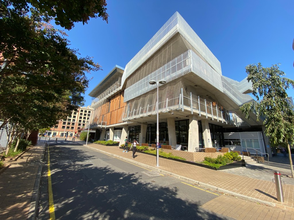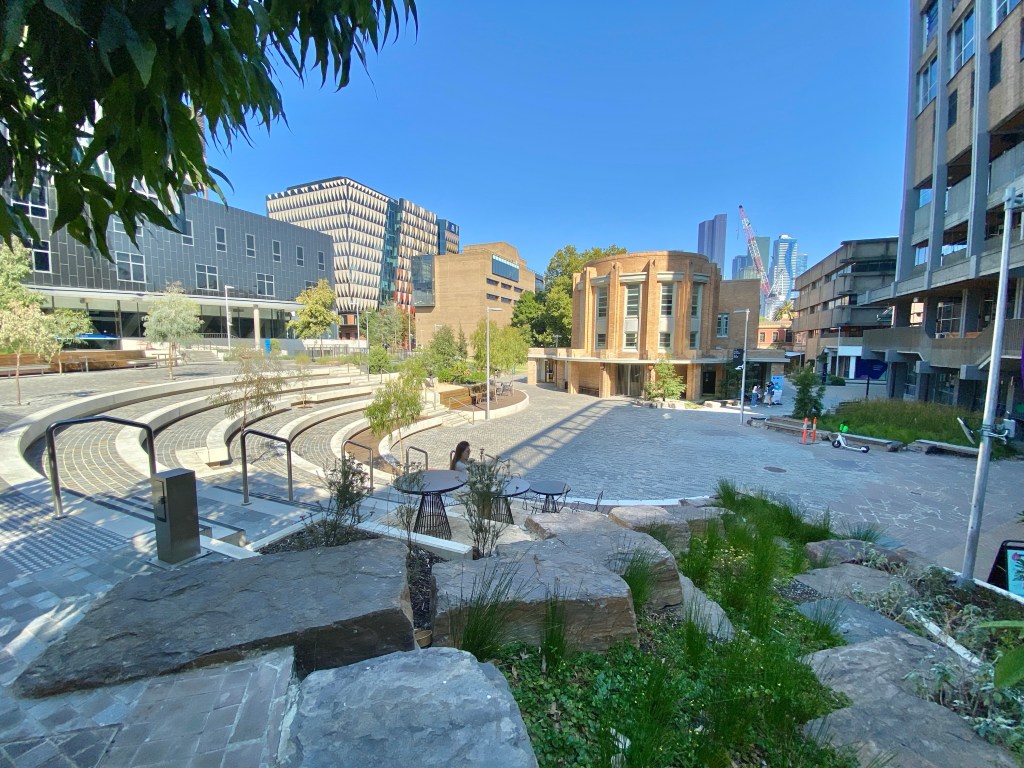As part of the creation of the student precinct at Melbourne Uni, the raised deck around the back of the stylish 1940 Frank Tait building by Percy Everett was removed, and now it’s the focal point of the generous landscaping, which slopes down toward it. Designed by @aspectstudios, there’s lots of places to sit, and planting, and a variety of paving, but my photos somehow don’t show it well. There’s maybe too much paving on the Swanston street entry area. The entry from the north is flanked by the Arts & Culture building, with the Union Theatre etc by @lyonsarchitecture, with lots of bulging balconies, not my taste, and on the other by the Student Pavilion, by @koningeizenberg, with the Roden White Library, which I like better but it’s rather madly busy. They both have lots of external circulation and places to sit, and interact, which all sounds nice. I was there on a Sunday so not much activity. There’s more of the fawn bricks that have been used in the uni’s landscaping since the 70s.