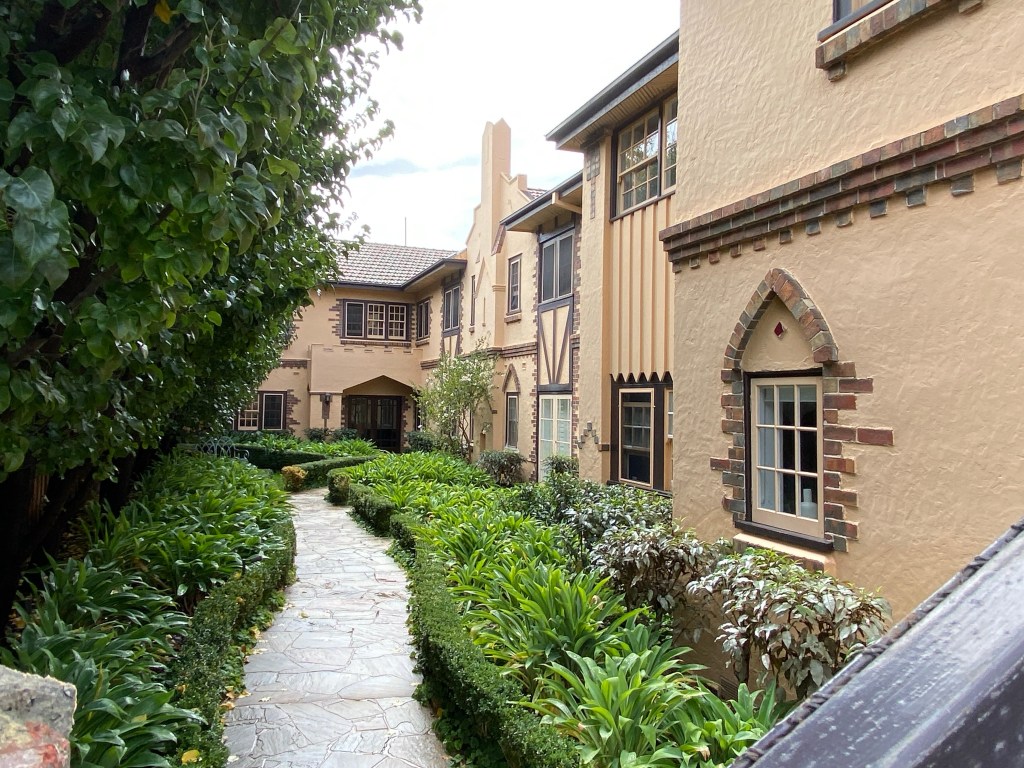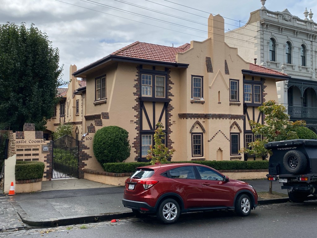A bit of Mock Tudor in East Melbourne- Castle Coombe, complete with half-timbering, pointed arches, prominent chimneys, and irregular brickwork. Something that looks really like it should be in St Kilda. Built in 1933, and designed by Bernard Evans, who also did flats in St Kilda and elsewhere in Tudor, Georgian and Deco modes. This one is fun, but not his best, with those odd empty vaguely pointed brick arches. Look perfectly nice inside, with mainly Deco detailing. Ad for a one bed shows each room about the same size, and the two bed has an oversized bedroom too. I guess room for a big wardrobe ?