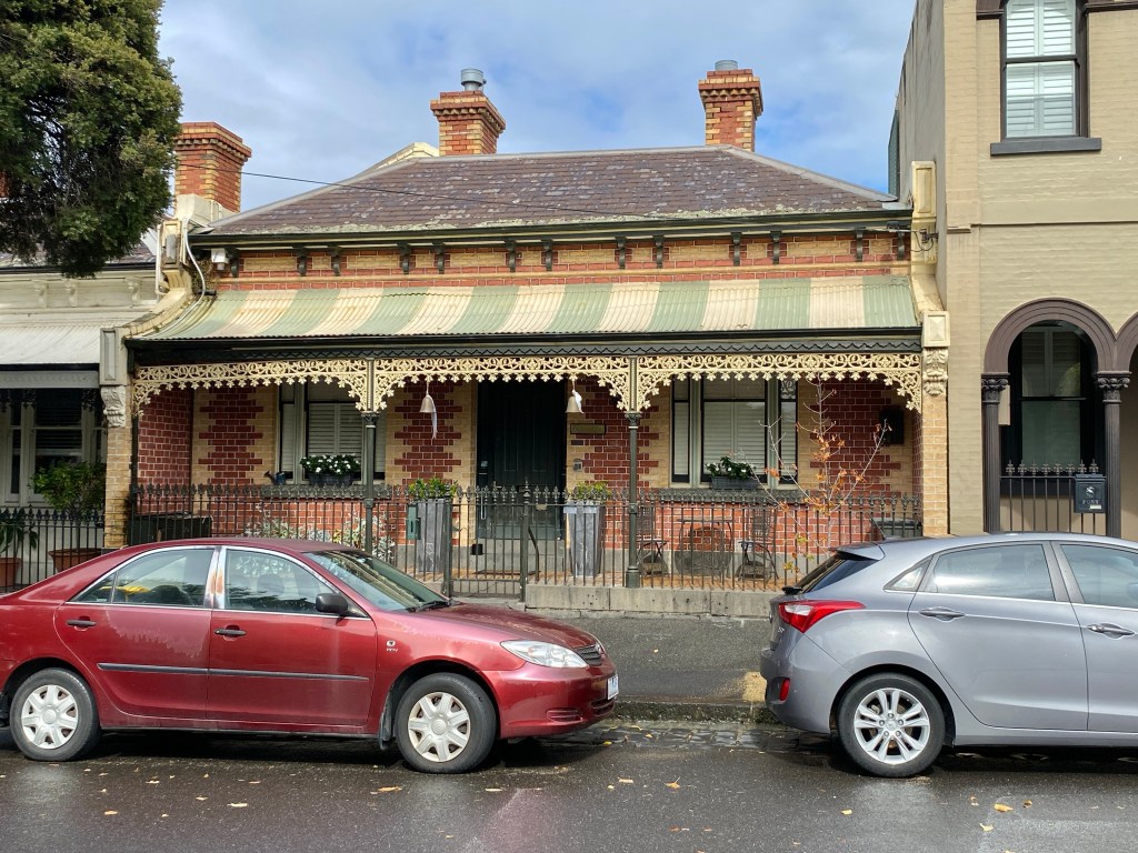 Rather choice polychrome brickwork on this terrace of three in Berry Street East Melbourne, built 1888. One of them got an unfortunate mansard addition at some point.