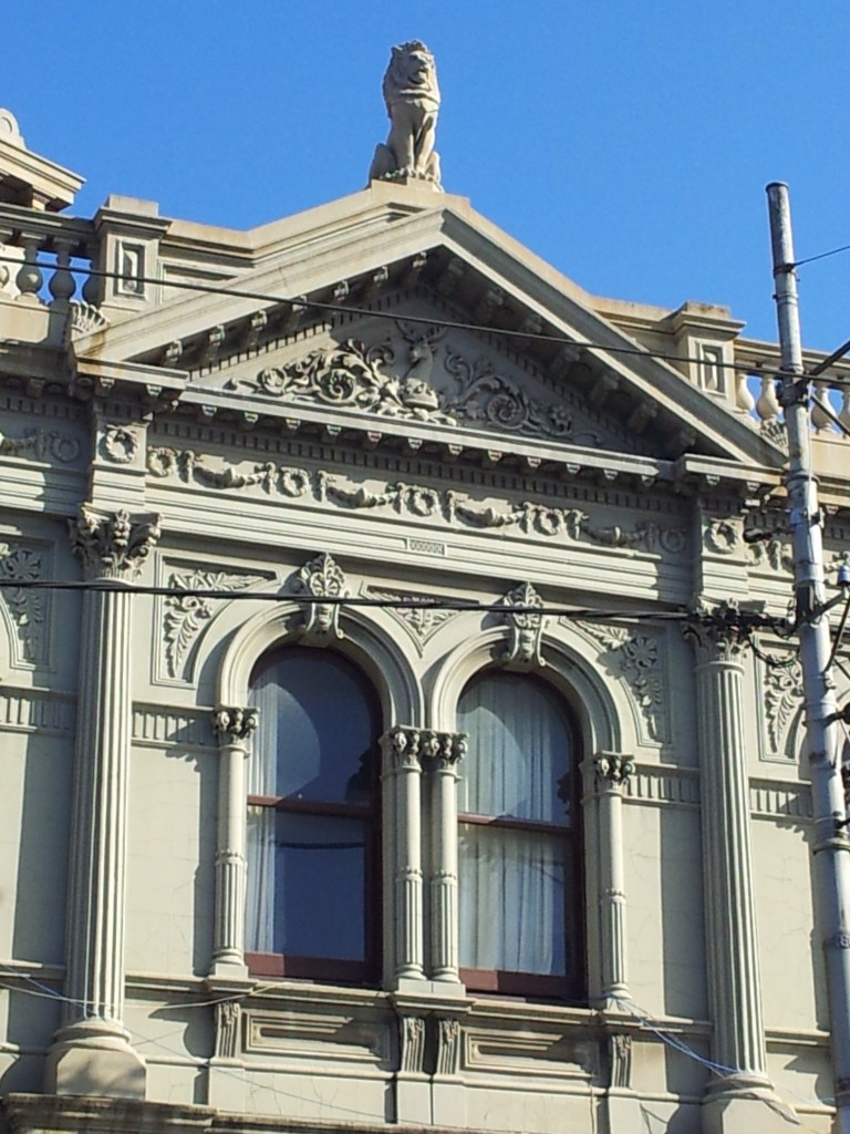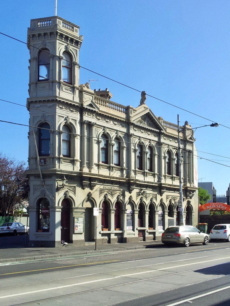 Generally known as the Fitzroy North Post Office, this fabbo pointy towered landmark on St Georges Road was originally built as a ‘land office’ in 1887, selling real estate at the height of the land boom of the 1880s. So it’s got a rich array of arches, columns, pediments, swags, lions too, all the frills, especially that tower, which originally had a dome to boot. Don’t know the architect who put it all together so nicely. In 1908 it become a post office, with upstairs a home for the post master or mistress, still a PO into the 90s I think. Then it was an antique store, and a cafe then about 2000 it became a pub, called the Pinnacle, which survived a smallish fire in 2015, still going. The corner room has rather elaborate cornices and a couple of decorated piers, recalling its heyday. Photos 2014, don’t think I’ve posted before. The marvellously atmospheric @library_vic B&W is from its time and a PO, judging from the dresses c1910, and pic 3 is 1963.