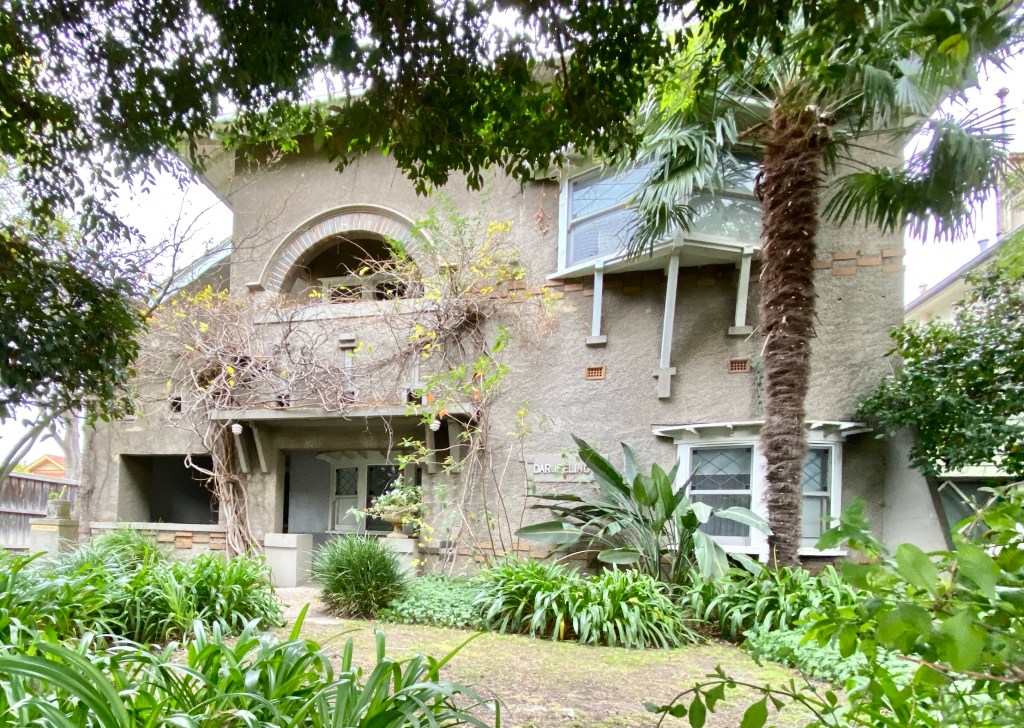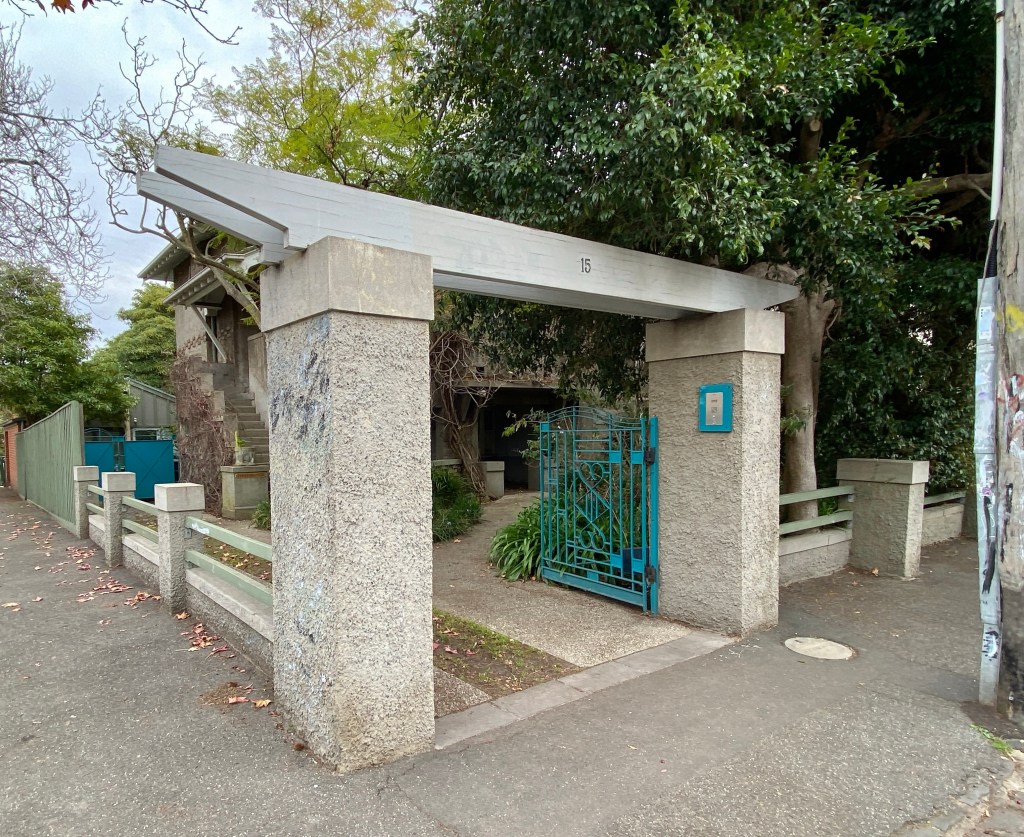 Great house in Foster Street St Kilda; actually it’s a two flat, looking like a single house. Probably about 1920, all lovely original unpainted rough cast, cute projecting bay windows, original fence with driveway portal thing etc. Not sure about the blue of the gate. Nice garden. Last sold in 2002, with just two interior pics. It’s probably a single house now.