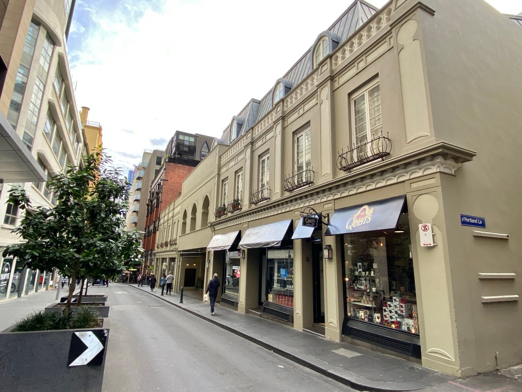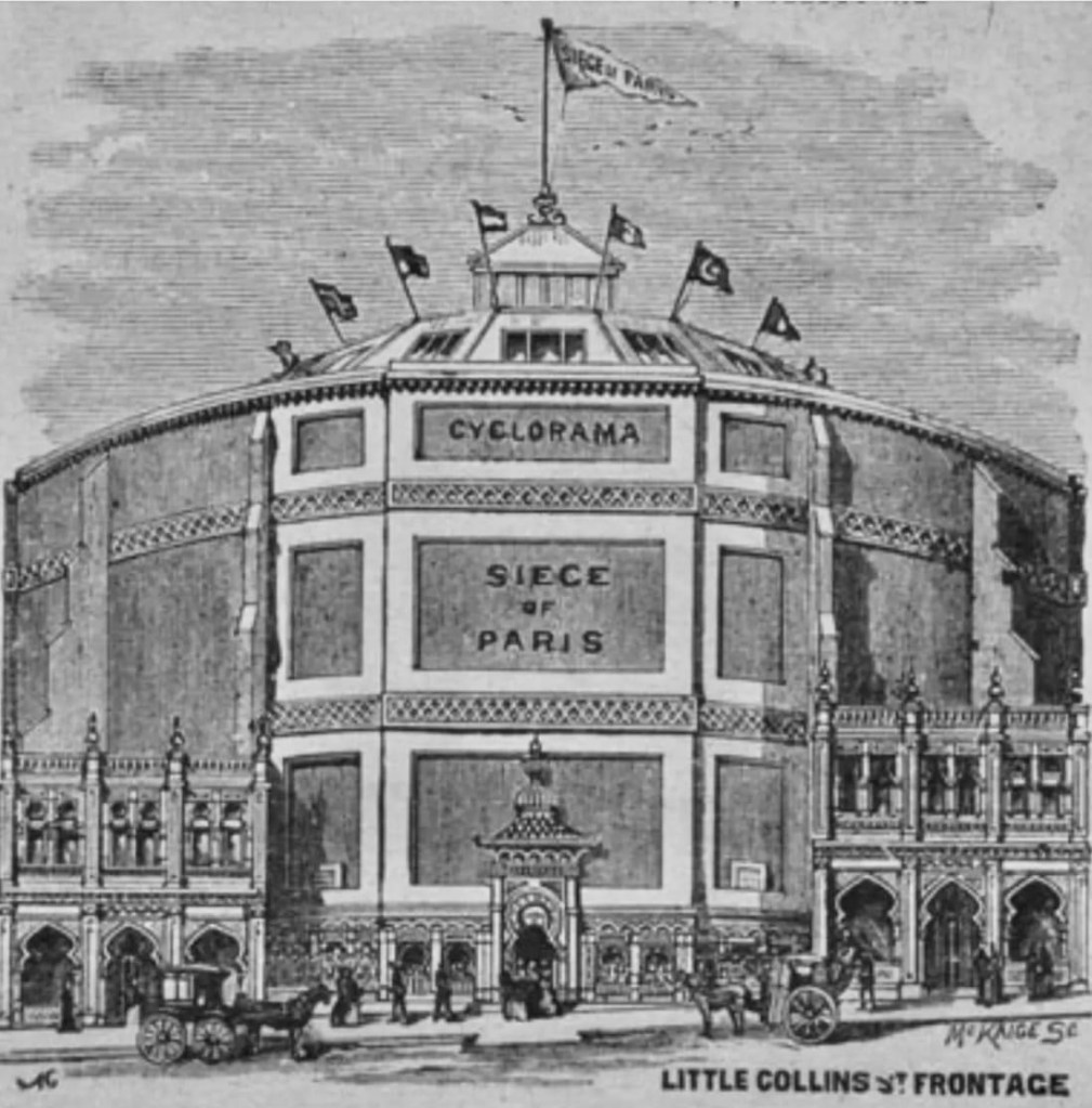This stylish but curious thing on Little Collins (once George’s Hostess Store) has a long and interesting history. It was first built in 1891 as a Cyclorama, a huge circular building that housed an illusionistic 360* painting, with a central viewing platform creating the illusion of being somewhere else – the first display here was the Siege of Paris in 1871, part of the Franco Prussian war. The main entrance was actually on Bourke Street through an existing shop, but there’s a sketch of the Little Collins Street front, which was in an exotic Moorish/Moghul style, the windows and shopfronts especially elaborate (last image, not very accurate ! and not certain quite so elaborate). The 1890s depression meant it was soon converted to other uses, with a new central upper floor from 1908 also in Moorish style. It became a printers by the 1920s, and they made the shopfronts much plainer, and in the late 40s the same with the upper windows. The entry and the shopfronts were completely replaced in 1960 for George’s. Then in 1995 it was converted into apartments, with new suitably Parisian style shopfronts, and a mansard level. So the fun Moorish detailing is part 1891, part 1908, and the upper floors in part follow the circular outline ! Because of all the changes it’s not heritage listed, but really should be, though not in any danger.