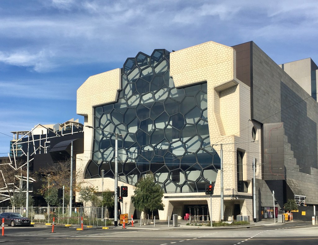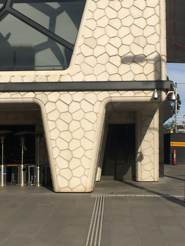 Melbourne Recital Centre, Southbank, photos from 2021. Opened in 2009, it was designed by @armarchitecture – the idea is it’s like a precious package, half opened still in its bubble wrap/polystyrene, and the bluestone side is the box it came in. Crazy and a bit literal, but I like it ! Especially the soap-bubble pattern. I first saw that idea on the 2008 Beijing Olympic Pool, where irregular shapes could become a kind of space frame.