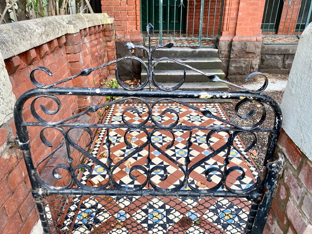 Likely designed by Blackett & Rankin in 1901, a lot of Arts & Crafts influence at a time when Queen Anne Edwardian was just catching on; WAM Blackett was known as an early adopter of Arts & Crafts, a style that didn’t get popular until about 1910. Real estate ads give the ‘Welsh Terrace’ name, which is emphasised by the individual houses named after Welsh towns, so presumably the builder/owner was from there (or thought it might appeal!). Interesting mostly original part cast iron fence, and at least one possibly original woven wire/wrought iron gate.