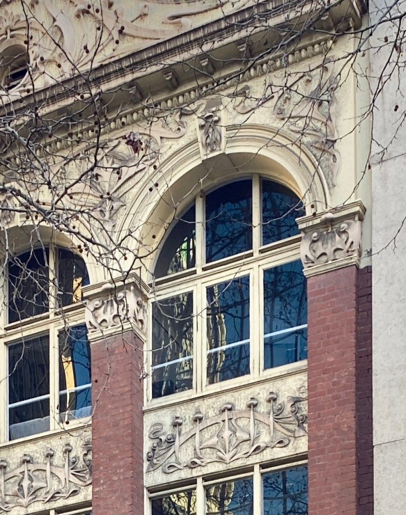 Very nice Edwardian warehouse with some very elaborate Art Nouveau decoration in Queen Street near Lonsdale. All super curly, sort of vegetal forms, but so abstracted looks like seaweed. Designed by Gibbs & Finlay, and built in 1904, as an investment for solicitor Alexander Grant, the first occupant being a lithographer. The first floor is very solid, built with wrought iron beams, and mass concrete supported on curved corrugated iron (might be the special German Traegerwellblech fireproof system, might not). Bad pic of mine from 2012. Top floor has nice timber lined ceiling (pic from Google maps). Heritage listed in 2013.