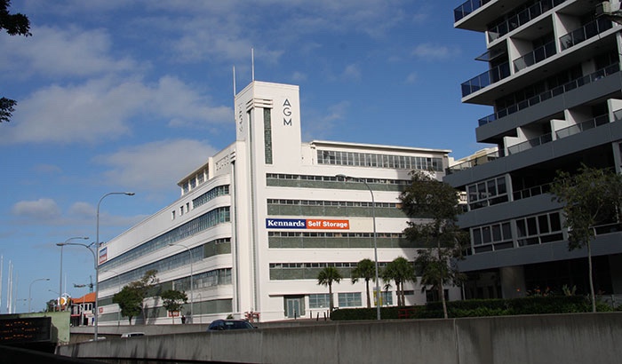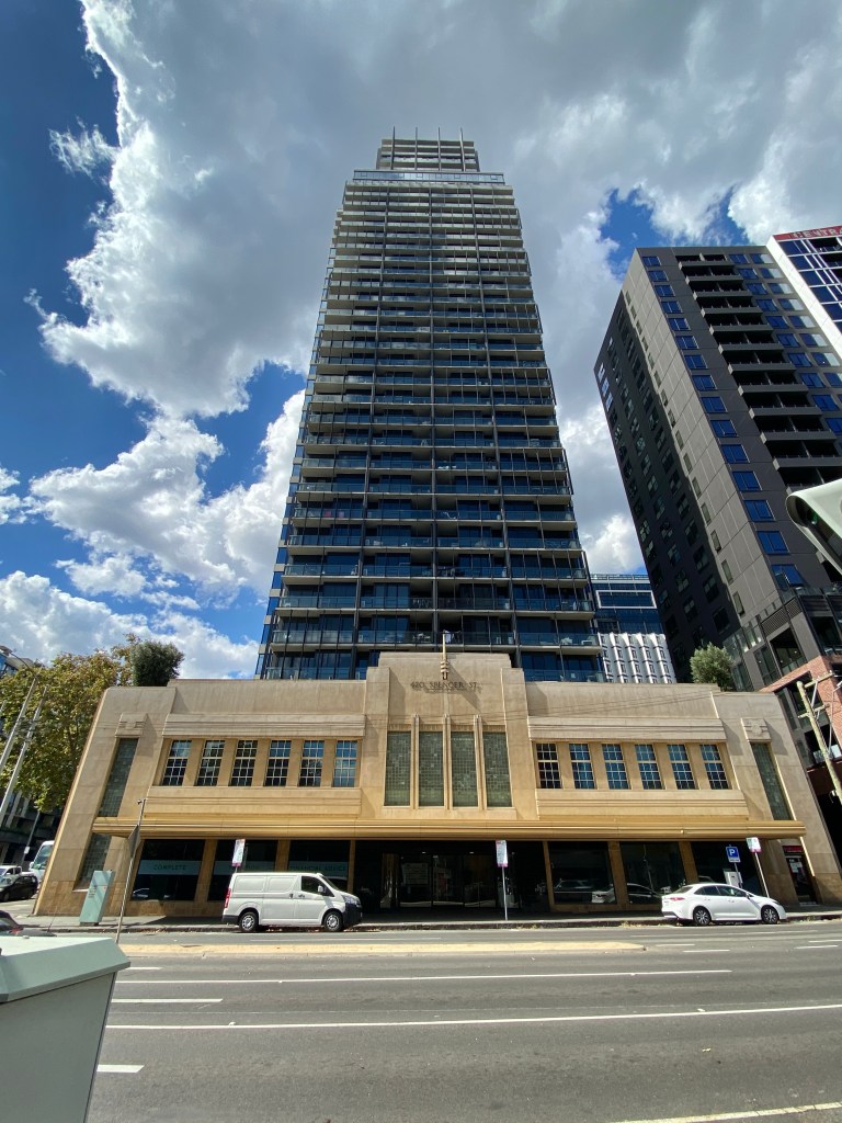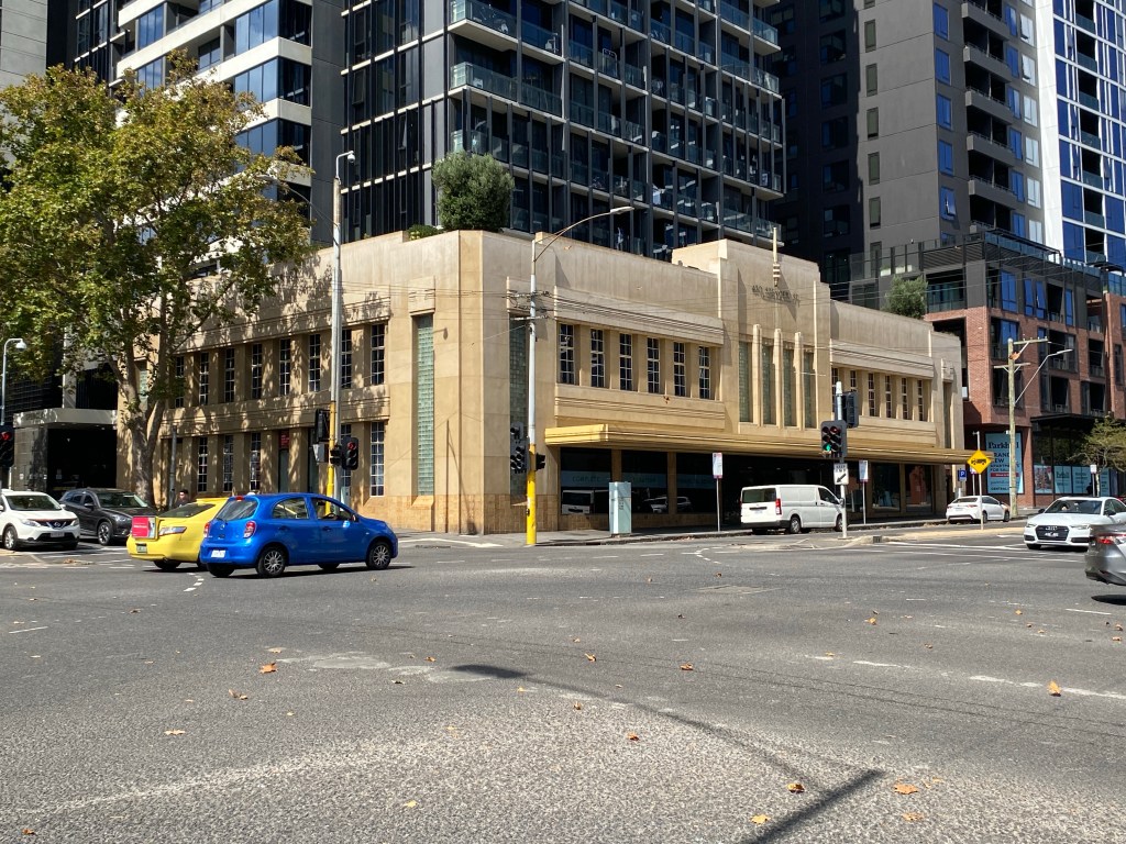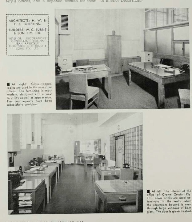A rather dramatic example of facadism on Spencer Street West Melbourne, completed in 2017. When first proposed in 2006, they were going to demolish it completely, since heritage listings were way behind, but the art deco & modernism society and the @nationaltrustvic successfully got the facades preserved, with substantial setbacks, but still … It was originally built in 1937 as the admin offices and showrooms of Australian Glass Manufacturers, which started out as a bottle works in Spottswood; the pics I found in the mag Decoration & Glass of the showroom show they stuffed it with probably their whole range of glassware products. They were mostly not very modern, unlike the nicely streamlined building, one of the later works by Tompkins & Tompkins, which also used glass blocks, one of their products – though not as much as their bigger HQ in Sydney of 1939 (last pic). The offices here were very restrained modern, with some glass blocks inside to boot.