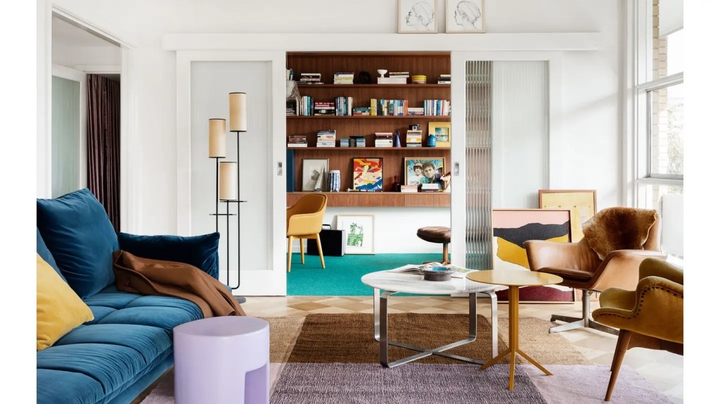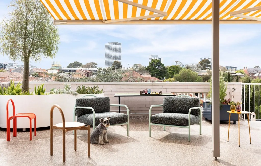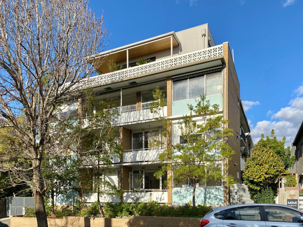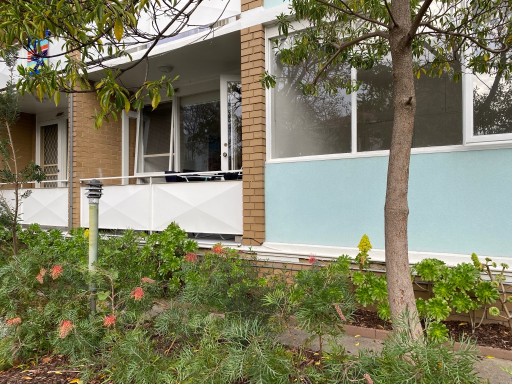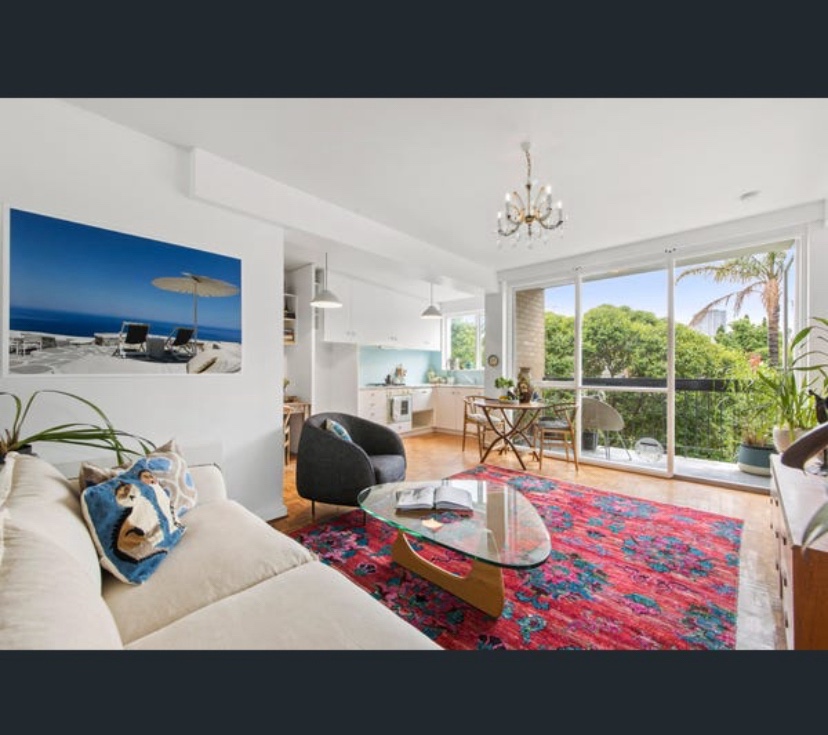 Striking 60s block in Eildon Road St Kilda, in a fetching shade of blue … which actually dates from around 2018. But I like it. Seems to be all modest 1 beds, except for the 4 bedroom penthouse with a rooftop entertaining room and deck behind the #breezeblock pats pet. Reputedly it was occupied by the owner /developer, which makes perfect sense. Featured in the Design Files in 2020, Google it to see the nice 60s style makeover by @wowowaarch – though they sold only a year later, as in last pic without the nice furniture.