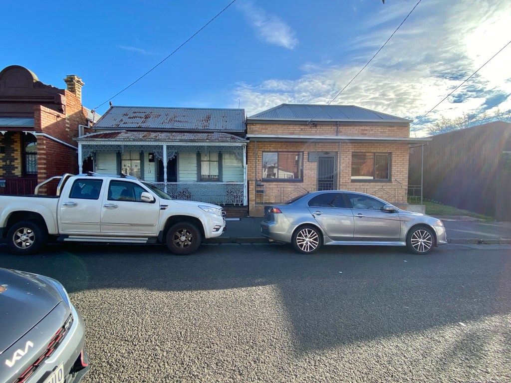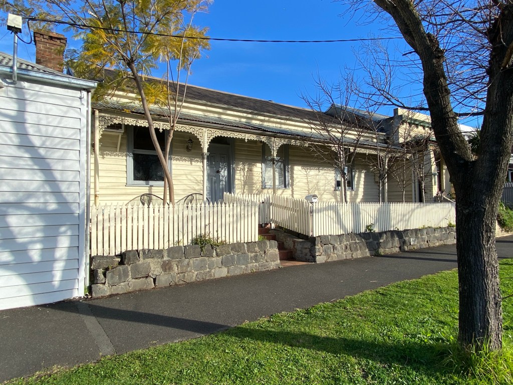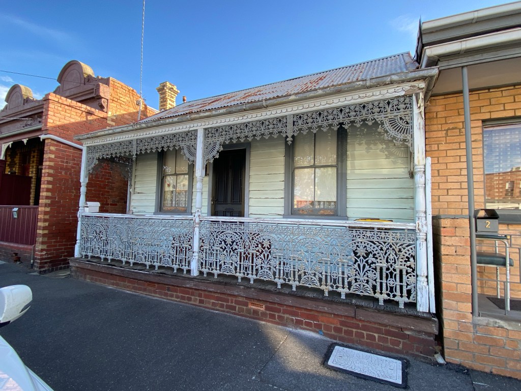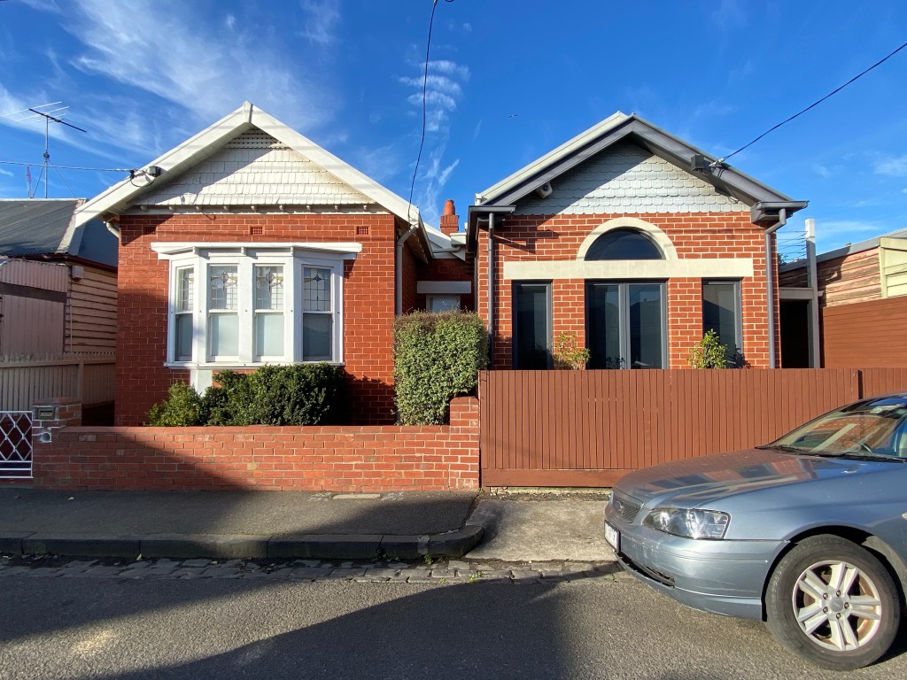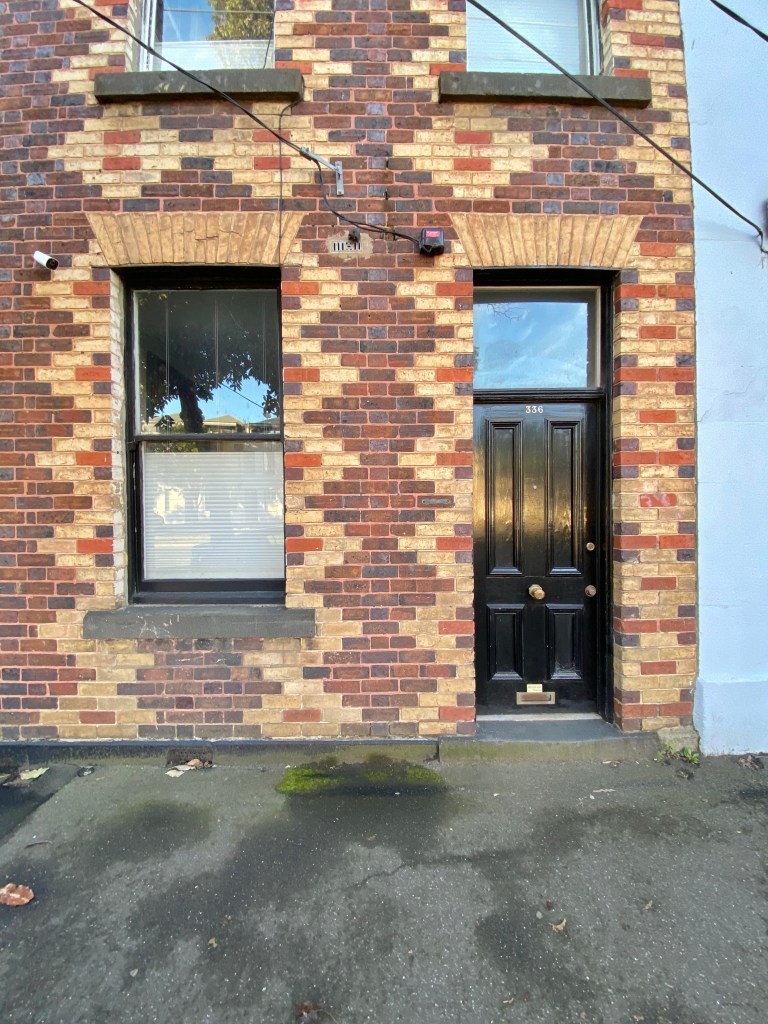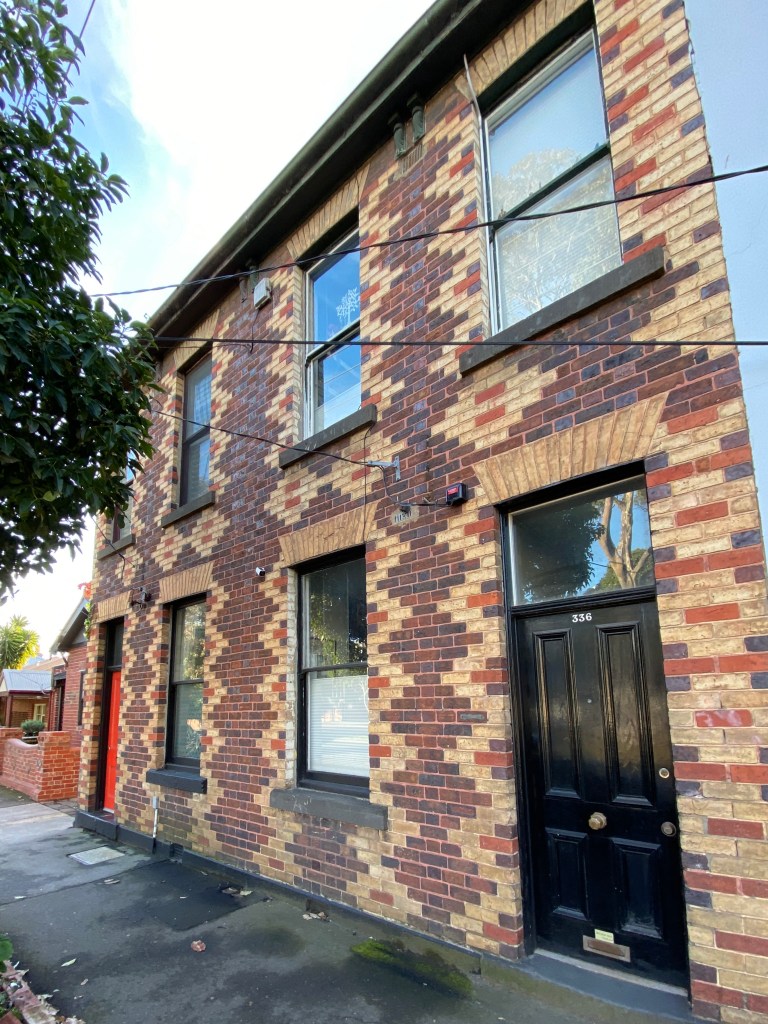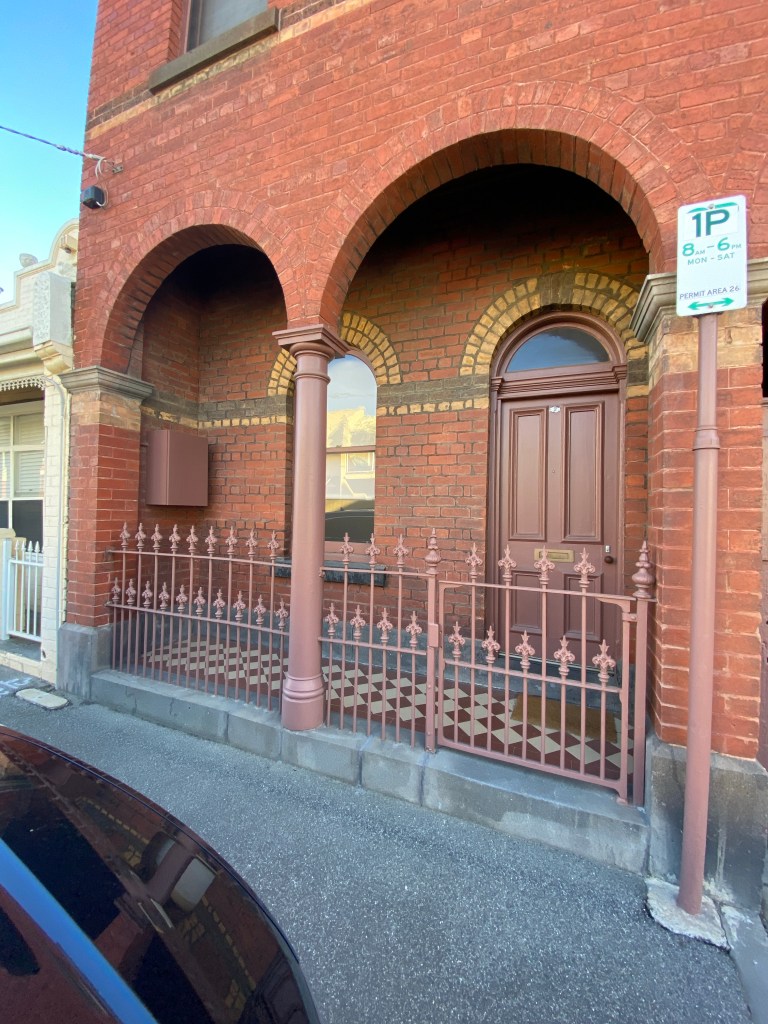 A rather strident polychrome terrace pair in Coventry Street South Melbourne. Probably tuck pointed originally. Love it.