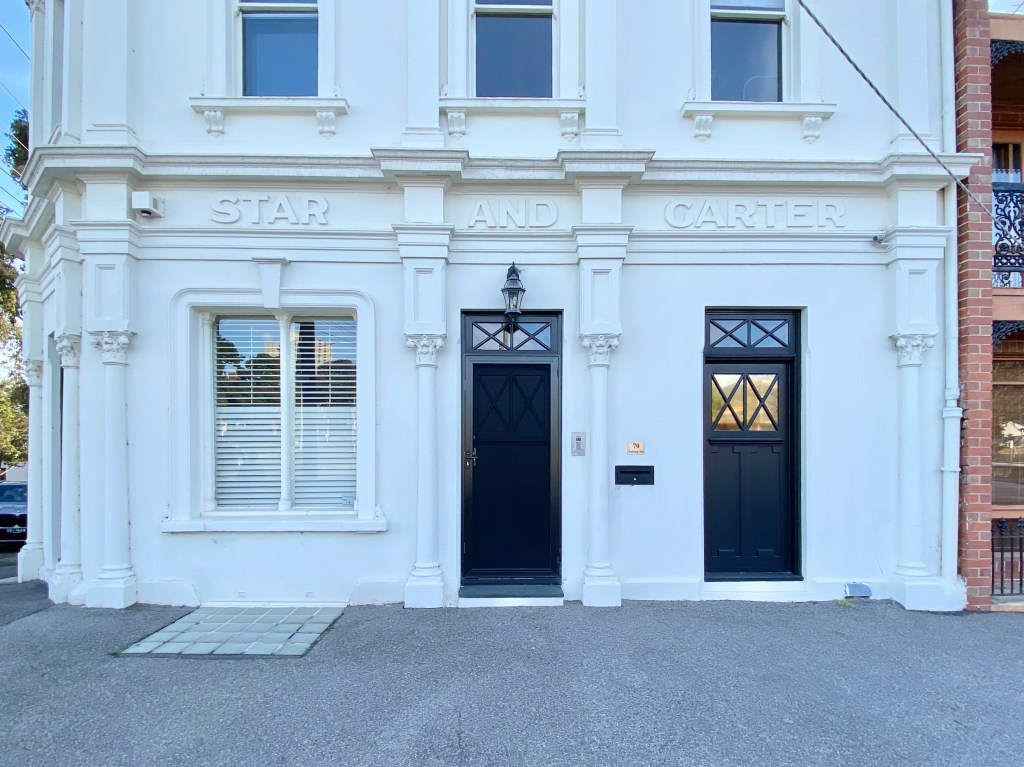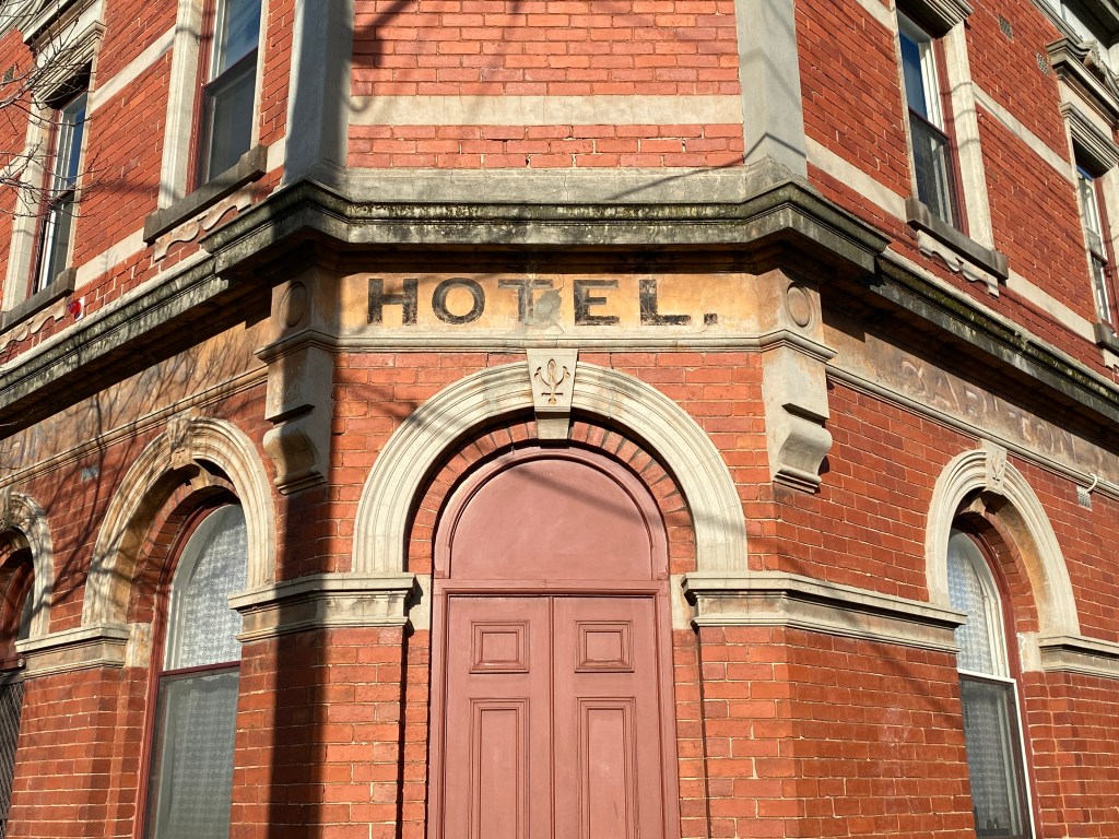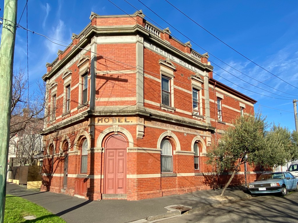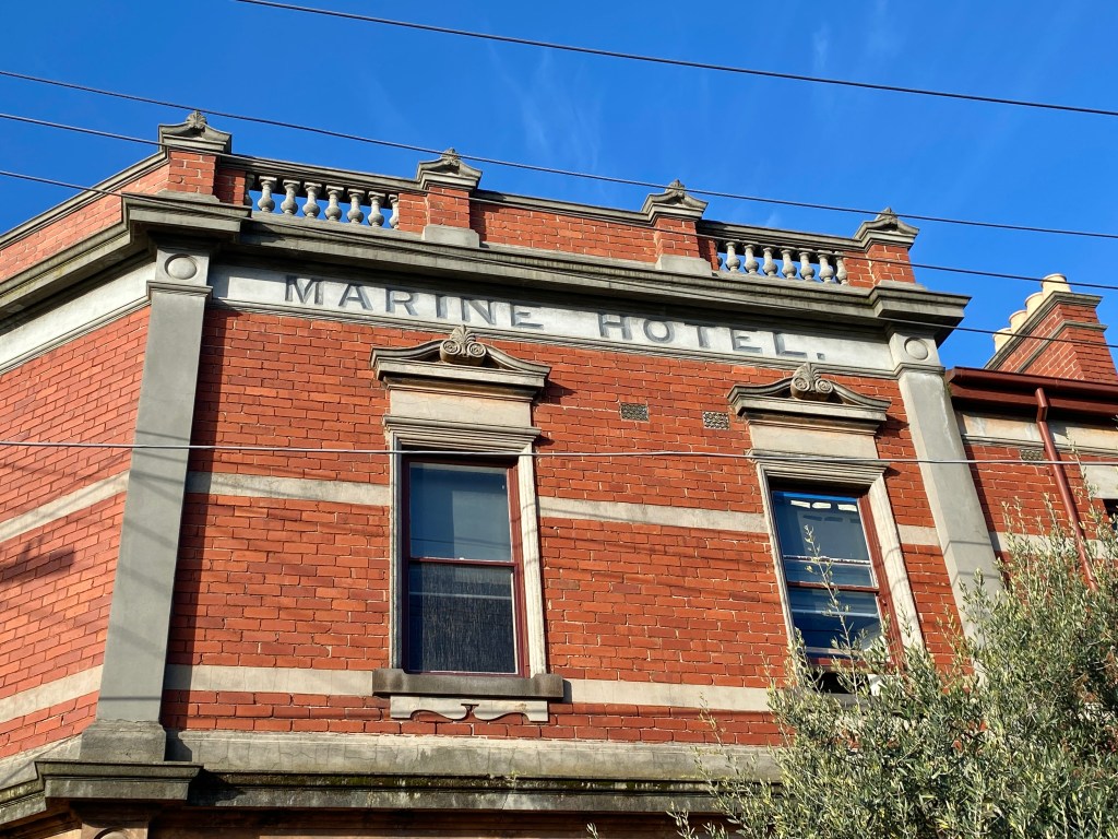 The ex-Marine Hotel cnr York and Morris Streets South Melbourne looking splendid in the winter sun, showing off original signage. A fine design in Queen Anne-ish red brick with scrolled pediments, it was built in 1892 replacing the 1858 original, and designed by the rather prolific Sydney Smith. It was delicensed in 1920, and looks like it might be a rooming house now. A couple of blocks away on Dorcas Street is the Star & Garter, built 1877 in a more elaborate classical style, which my photos don’t capture well (pics 4,5). It was still going until 2000, now it’s three units. And two blocks along there’s the former Queens Arms hotel (pictured 6), looking rather sad but notable as the area’s first hotel, opening in 1854, closing in 1883. Then in 1887 the boarding house across the narrow side street became the Prince of Wales hotel (pic 7) – like many inner suburbs, you didn’t have to go far if you were thirsty ! Last pic not mine.