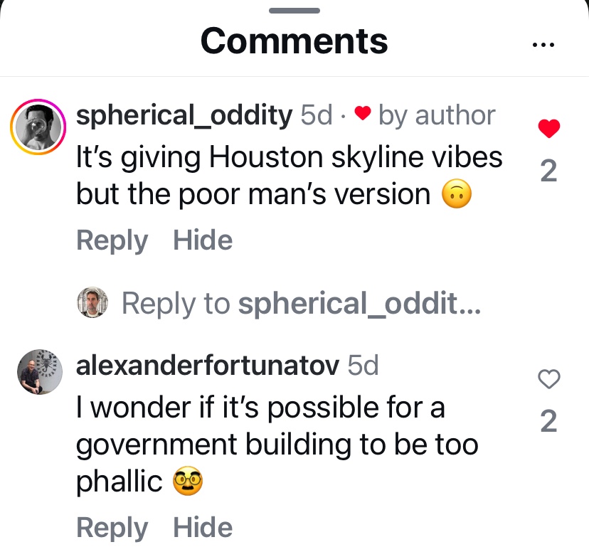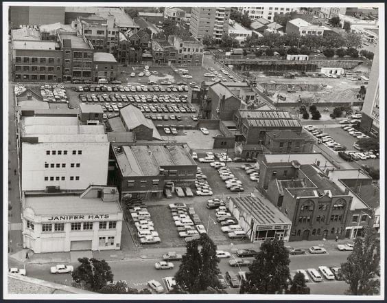 Casselden Place tower, Spring & Lonsdale, 1992. I’m a fan of Postmodernism, but this isn’t a good example. The tower itself is sort of striking, all #chamfers and 45* angles, the design idea being a glassy square tower shoved through an almost octagonal solid one. However, it lacks the intended dome, which I heard didn’t happen cos it was too phallic. I also like pink, but here the precast panels just look flat and cheap, and the various gaps and the strip windows undermine the attempt at solidity. Designed by the talentless or budget conscious Commonwealth Govt Architects, with #hassellstudio. Further rant 2024: the podium levels are very bad in urban terms too – it’s super clunky 9 floors lots of flat wall, a bit vertical a bit horizontal, nothing at street level of interest, and just has gaps at the bottom for an entrance, not at all inviting, which just leads to empty space partly outside partly inside (pics borrowed from @chrismbr), just columns and glass. And the back sides are the same tall stolid walls, all quite the opposite of the Telstra HQ built the same time down the block, which has low scale edges, incorporating a number of older buildings and even a laneway so you can wander through…. and what’s more Casselden built over most of the lane it’s named after ! Old photos dating from 1950, 1967 and c1970 show various buildings, including a nice big brick deco block on Lonsdale; it all could have been so much better. (I actually remember Janifer Hats from trips into town as a kid, though I thought it was Jennifer.)